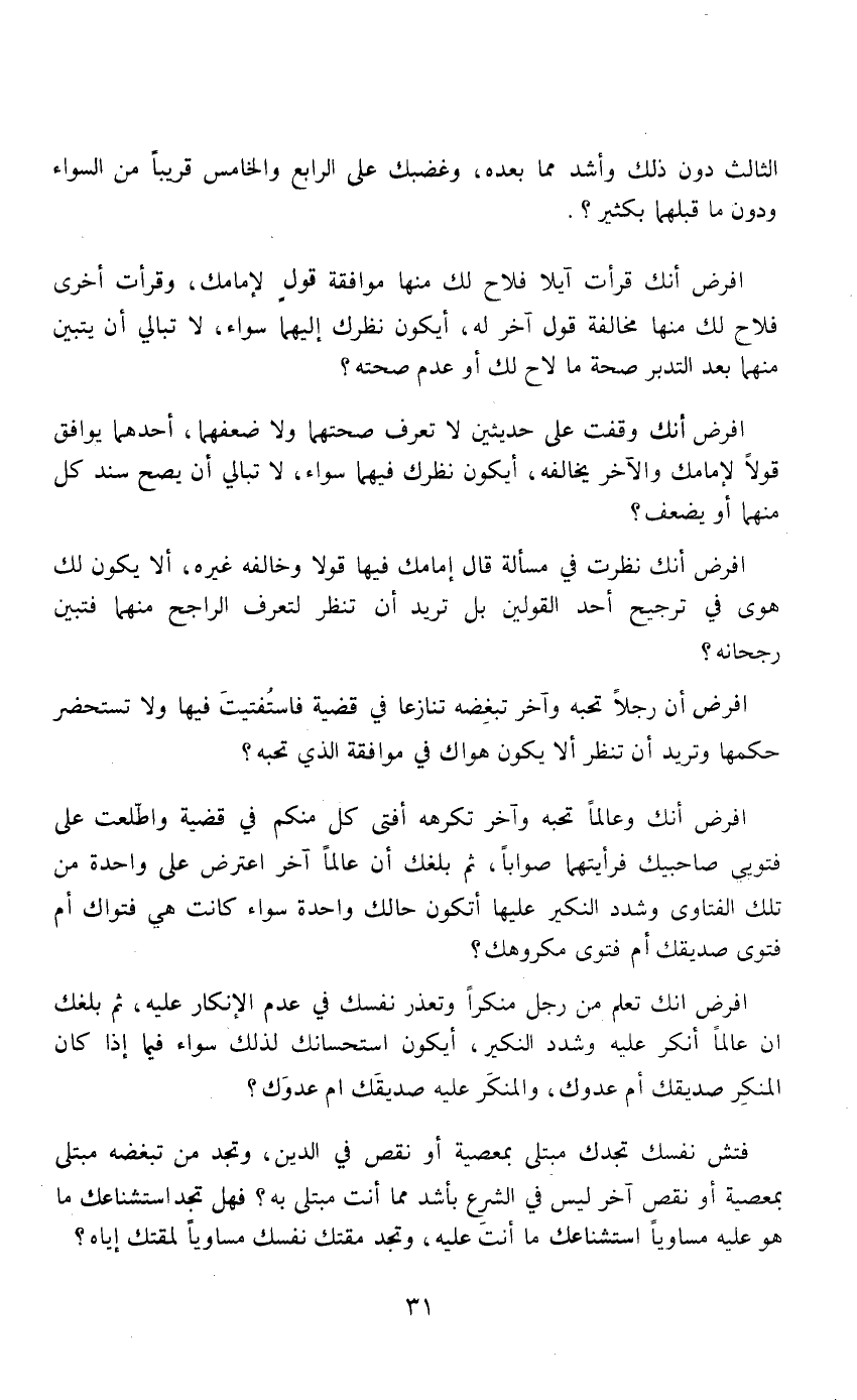 فتش نفسك تجدك مبتلى بمعصية أو نقص في الدين، وتجد من تبغضه مبتلى بمعصية أو نقص آخر ليس في الشرع بأشدمما أنت مبتلى به؟ فهل تجد إستشناعك ما هو عليه مساوياً لإستشناعك ما أنت عليه، وتجد مقتك نفسك مساوياً لمقتك إياه؟