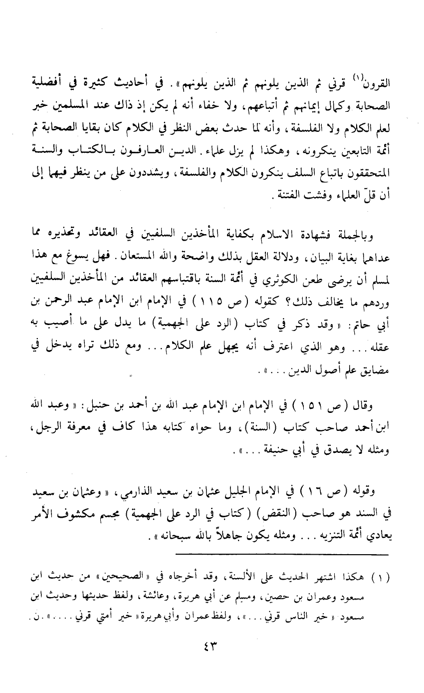 القرون (1) قرني ثم الذين يلونهم ثم الذين يلونهم» . في أحاديث كثيرة في أفضلية الصحابة وكمال إيمانهم ثم إتباعهم، ولا خفاء أنه لم يكن إذا ذاك عند المسلمين خير لعلم الكلام ولا الفلسفة، وأنه لما حدث بعض النظر في الكلام كان بقايا الصحابة ثم أئمة التابعين ينكرونه، وهكذا لم يزل علماء الدين العارفون بالكتاب والسنة المتحققون بأتباع السلف ينكرون الكلام والفلسفة، ويشددون على من ينظر فيهما إلى أن قل العلماء وفشت الفتنة.