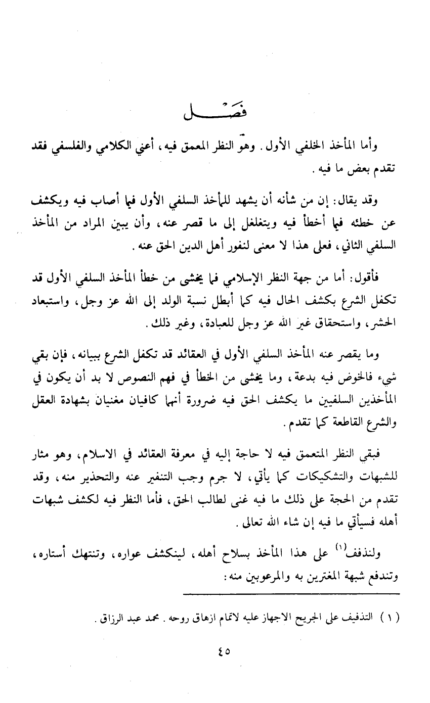 فأقول: أما من جهة النظر الإسلامي فما يخشى من خطأ المأخذ السلفي الأول قد تكفل الشرع بكشف الحال فيه كما أبطل نسبة الولد إلى الله عز وجل، وستبعاد الحشر، واستحاق غير الله عز وجل للعبادة، وغير ذلك.