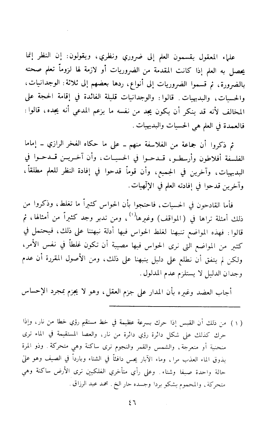 (1) من ذلك أن القبس إذا حرك بسرعة عظيمة في خط مستقيم رؤي خطا من نار، وإذا حرك كذلك على شكل دائرة رؤي دائرة من نار، والعصا المستقيمة في الماء ترى منحنية أو متعرجة، والشمس والقمر والنجوم ترى ساكنة وهي متحركة. وذو المرة يذوق الماء العذب مرا، وماء الآبار يحس دافئا في الشتاء وباردا في الصيف وهو على حالة واحدة سيفا وشتاء. وعلى رأي متأخري الفلكيين ترى الأرض كسامنة وهي متحركة، والمحموم يشكوبردا وجسده حار الخ. محمد عبد الرزاق.