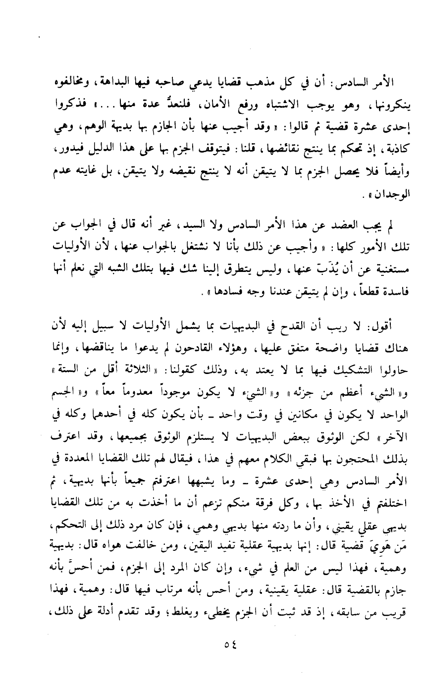 أقول لا ريب أن القدح في البديهيات بما يشمل الأوليات لا سبيل إليه لأن هناك قضايا واضحة متفق عليها، وهؤلاء القادحون لم يدعوا ما يناقضها، وإنما حاولوا التشكيك فيها بما لا يعتد به، وذل كقولنا: «الثلاثة أقل من الستة» و «الشيء أعظم من جزئه» و «الشيء لا يكون موجوداً معدوماً» و «والجسم الواحد لا يكون في مكانين في وقت واحد - بأن يكون كله في أحدهما وكله في الآخر» لكن الوثوق ببعض البديهيات لا يستلزم الوثوق بجميعها، وقد اعترف بذلك المحتجون بها فبقي الكلام معهم في هذا، فيقال له تلك القضايا المعددة في الأمر السادس وهي إحدى عشرة - وما يشابهها اعترفتم جميعاً بأنها بديهية، ثم اختلفتم في الأخذ بها، كل فرقة منكم تزعم أن ما أخذت به من تلك القضايا بديهي عقلي يقيني، وأن ماردته منها بديهي وهمي، فإن كان مرد ذلك إلى التحكم، مَنْ هَوِيَ قضية قال: إنها بديهية عقلية تفيد اليقين، ومن خالفت هواه قال: بديهية وهمية، فهذا ليس من العلم في شيء وإن كان المرد إلى الجزم، فمن أحس بأنه جازم بالقضية قال: عقلية يقينية، ومن أحس بأنه مرتاب فيها قال: وهمية، فهذا قريب من سابقه، إذ قد ثبت أن الجزم يخطئ ويغلط، وقد تقدم أدلة على ذلك،