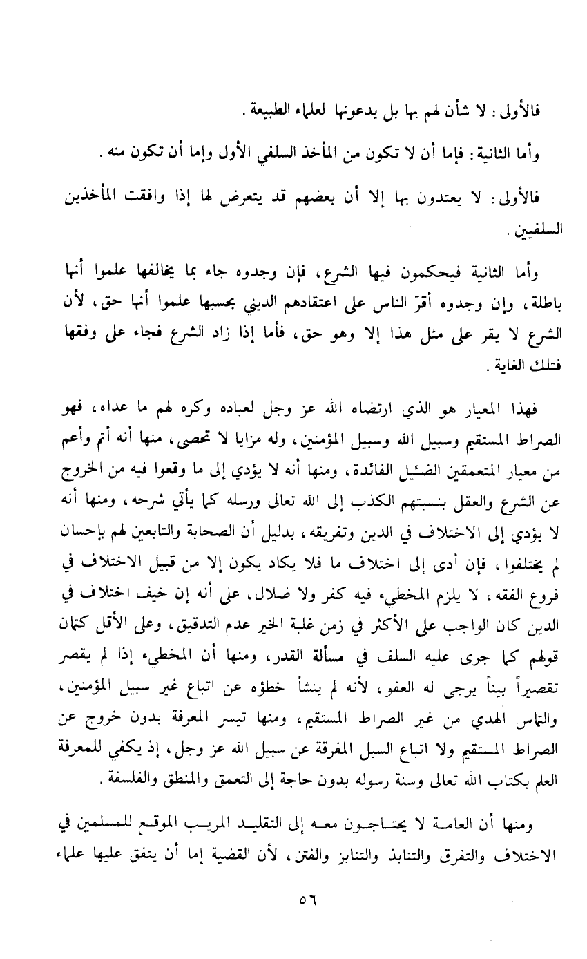 وأما الثاني فيحكمون فيها الشرع، فإن وجدوه جاء بما يخالفها علوا أنها باطلة، وإن وجدوه أقر الناس على اعتقادهم الديني بحسبها علموا أنها حق، ولأن الشرع لا يقر على مثل هذا إلا وهو حق، فأما إذا زاد الشرع فجاء على وفقها فتلك الغاية.فهذا المعيار هو الذي ارتضاه الله عز وجل لعباده وكره لهم ما عداه، فهو الصراط المستقيم وسبيل الله وسبيل المؤمنين، وله مزايا لا تحصى، ومنها أنه أتم وأعم من معيار المتعمقين الضئيل الفائدة، ومنها أنه لا يؤدي إلى ما وقعوا فيه من الخروج عن الشرع والعقل بنسبتهم الكذب إلى الله تعالى ورسله كما سيأتي شرحه، ومنها انه لا يؤدي إلى الاختلاف في الدين وتفريقه، بدليل أن الصحابة والتابعين عليهم لهم بإحسان لم يختلفوا، فان أدى إلى اختلاف ما فلا يكاد يكون ألا من قبيل الاختلاف في فروع الفقه، لا يلزم المخطئ كفر ولا ضلال، على انه إن خيف اختلاف في الدين كان الواجب على الأكثر في زمن غلب فيه الخير عدم التدقيق، وعلى الأقل كتمان قولهم كما جرى عليه السلف في مسئله القدر، ومنها أن المخطئ إذا لم يقصر تقصيرا بينا يرجى له العفو، لأنه لم ينشأ خطأو هـ عن اتباع غير سبيل المؤمنين، والتماس الهدي من غير الصراط المستقيم، ومنها تيسر المعرفة بدون الخروج عن الصراط المستقيم ولا السبل المفرقة عن سبيل الله عز وجل، إذ يكفي للمعرفة العلم بكتاب الله تعالى وسنة رسوله بدون حاجة إلى التعمق في المنطق والفلسفة.