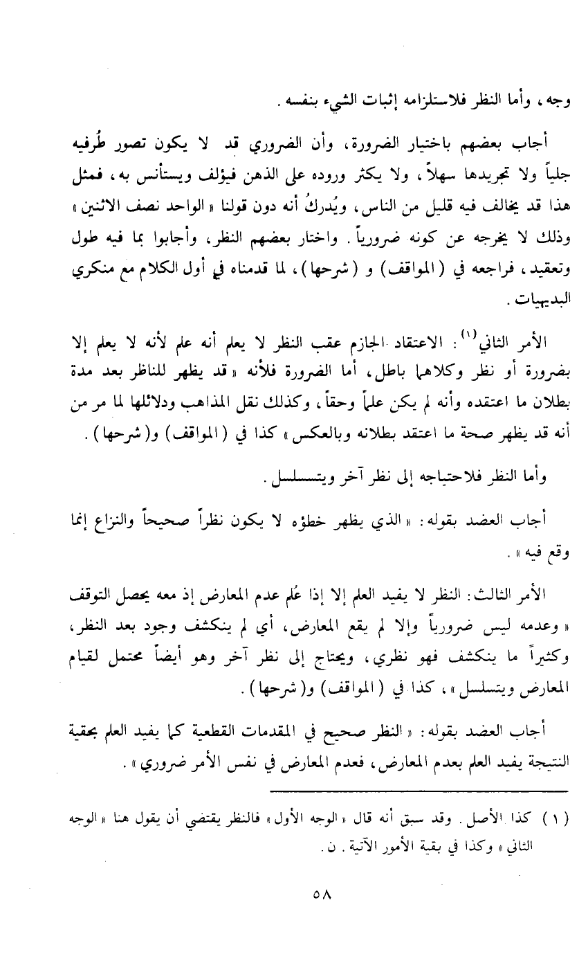 الأمر الثاني (1) : الاعتقاد الجازم عقب النظر لا يعلم أنه علم لأنه لا يعلم إلا بضرورة أو نظر وكلاهما باطل، أما الضرورة فلأنه «قد يظهر للناظر بعد مدة بطلان ما أعتقده وأنه لم يكن علماً وحقاً، وكذلك نقل المذاهب ودلائلها لما مر من أنه قد يظهر صحة ما أعتقد بطلانه وبالعكس» كذا في (المواقف) و (شرحها) .
