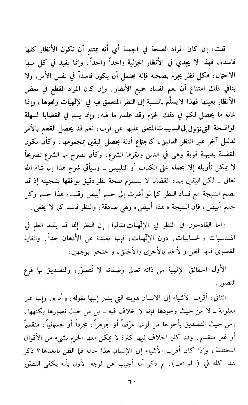 قلت: إن كان المراد الصحة في الجملة أي أن يمتنع أن تكون النظار كلها فاسدة، فهذا لا يجدي في الأنظار الجزئية واحداً واحداً، وإنما يفيد في كل منها الاحتمال، فكل نظر يجزم بصحته فإنه يحتمل أن يكون فاسداً في نفس الأمر، ولا ينافي ذلك امتناع أن يعم الفساد جميع الأنظار. وإن كان المراد القطع في بعض الأنظار بعينها فهذا لا يسلم بالنسبة إلى النظر المتعمق فيه في الإلهيات ونحوها، وإنما غاية ما يحصل لكم في ذلك الجزم وقد علمتم ما فيه، وإنما يسلم في القضايا السهلة الواضحة التي تؤول إلى البديهيات المتفق عليها عن قرب، نعم قد يحصل القطع بالأمر لدليل آخر غير النظر الدقيق، كاجتماع أدلة يحصل اليقين بمجموعها، وكأن تكون القضية بديهية قوية وهي في الدين ويقرها الشرع، وكأن يصرح بها الشرع تصريحاً لا يمكن تأو بله إلا بجملة على الكذب أو التلبيس - وسيأتي شرح هذا إن شاء الله تعالى - لكن اليقين بهذه القضايا لا يستلزم صحة نظر دقيق يوافقها بنتيجته إذ قدح تصح النتيجة مع الفساد النظر كما لوأشرت إلى جسم أبيض وقلت: هذا جسم وكل جسم أبيض، فإن النتيجة «هذا أبيض» وهي صادقة، والنظر فاسد كما لا يخفى.
