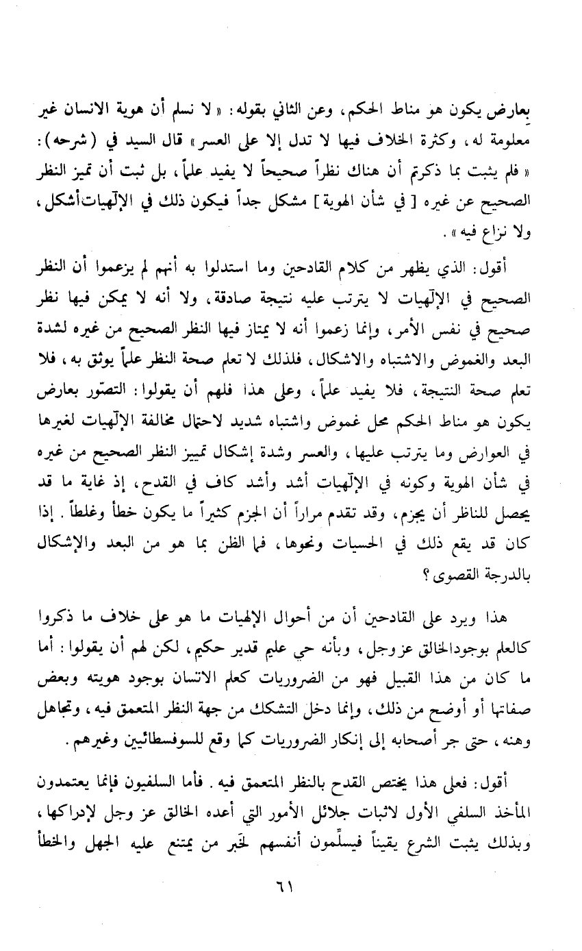 أقول: فعلى هذا يختص القدح بالنظر المتعمق فيه. فأما السلفيون فإنما يعتمدون المأخذ السلفي الأول لاثبات جلائل الأمور التي أعده الخالق عز وجل لإدراكها، وبذلك يثبت الشرع يقيناً فيسلمون أنفسهم لخبر من يمتنع عليه الجهل والخطأ