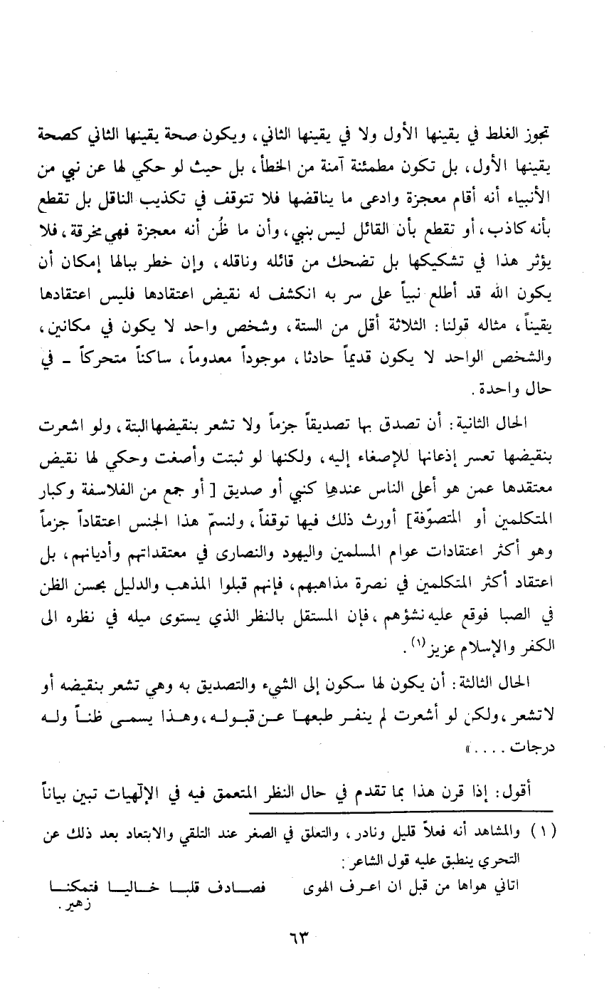 الحال الثانية: أن بها تصديقاً جزماً ولا تشعر بنقيضها البتة ولوأشعرت بنقيضها تعسر إذعانها للإصغاء إليه، ولكنها لوثبتت وأصغت وحكي لها نقيض معتقدها عمن هو أعلى الناس عندها كنبي أو صديق «أو أجمع الفلاسفة وكبار المتكلمين أو المتصوفة» أو رث ذلك فيها توقفاً، ولنسم هذا الجنس اعتقاداً جزماً وهو أثر اعتقادات عوام المسلمين واليهود والنصارى في معتقداتهم وأديانهم، بل اعتقاد أكثر المتكلمين في نصرة مذاهبهم، فإنهم قبلوا المذهب والدليل بحسن الظن في الصبا فوقع عليه نشؤهم فإن المستقل بالنظر الذي يستوي مليه في نظره إلى الكفر والإسلام عزيز.