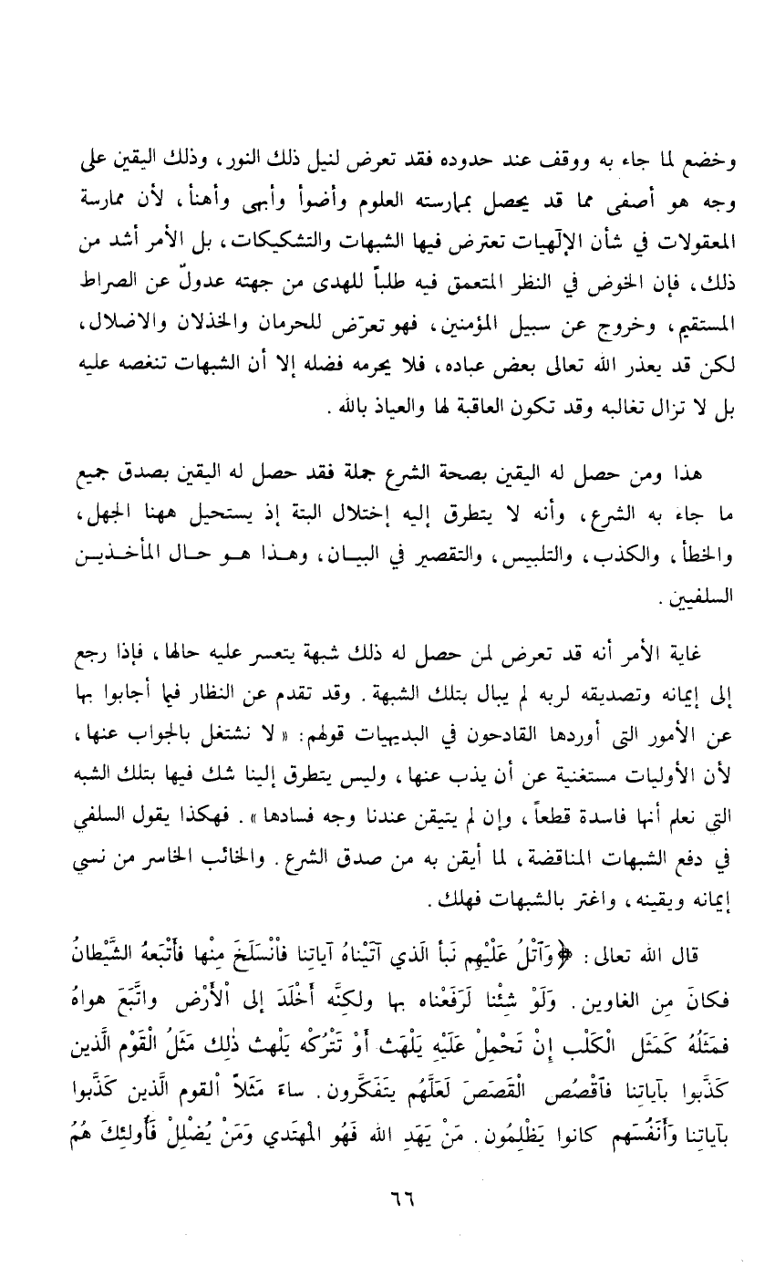 غاية الأمر أنه قد تعرض لمن حصل ذلك شبهة يتعسر عليه حلها، فإذا رجع إلى إيمانه وتصديقه لربه لم يبال بتلك الشبهة. وقد تقدم عن النظار فيما أجابوا به عن الأمور التي أو ردها القادحون في البديهيات قولهم: «لا نشتغل بالجواب عنها، لأن الأوليات مستغنية عن أن يذب عنها، وليس يتطرق إلينا شك فيها بتلك الشبهة التي نعلم أنها فاسدة قطعاً، وإن لم يتيقن عندنا وجه فسادها» . فهكذا يقول السلفي في دفع الشبهات المناقضة، لما أيقن به من صدق الشرع. والخائب الخاسر من نسي إيمانه ويقينه، واغتر بالشبهات فهلك.