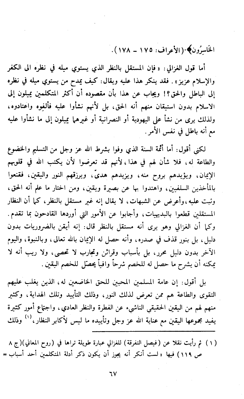 (1) ثم رأيت نقلاً عن (فيصل التفرقة) للغزالي عبارة طويلة تراها في (روح المعاني) ج 8 ص 119 فيها «لست أنكر يجوز ان يكون ذكر أدلة المتكلمين أحد أسباب =