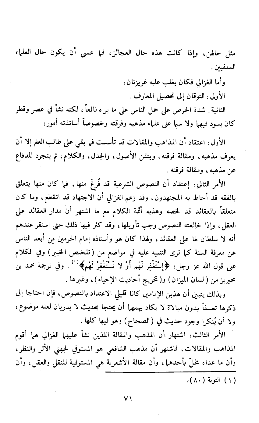 الأمر الثاني: اعتقاد أن النصوص الشرعية قد فرغ منها، فما كان منها يتعلق بالفقه قد أحاط به المجتهدون، وقد زعم الغزالي أن الاجتهاد قد أنقطع، وما كان متعلقاً بالعقائد قد لخصه وهذبه أئمة الكلام مع ما أشتهر أن مدار العقائد على العقل، وإذا خالفته النصوص وجب تأويلها، وقد كثر فيها ذلك حتى أستقر عندهم أنه لا سلطان لها على العقائد، ولهذا كان هو وأستاذه إمام الحرمين من أبعد الناس عن معرفته السنة كما ترى التنبيه عليه في مواضع من (تلخيص الخبير) وفي الكلام عن قول الله عز وجل: «اسْتَغْفِرْ لَهُمْ أَوْ لَا تَسْتَغْفِرْ لَهُمْ» .