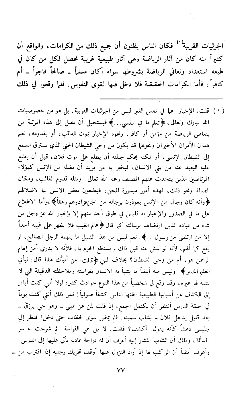 (1) قلت: الإخبار عما في نفس الغير ليس من الجزئيات القريبة، بل هو من خصوصيات الله تبارك وتعالى، (تعلم ما في نفسي ... ) فيستحيل أن يصل إلى هذه المرتبة من يتعاطى الرياضة من مؤمن أو كافر، ونحوه الإخبار بموت الغائب، أو بقدومه، نعم هذان الأمران الأخيران ونحوهما قد يكون من وحي الشيطان الجني الذي يسترق السمع إلى الشيطان الإنسي، أو يمكنه بحكم جبلته أن يطلع على موت فلان، قبل أن يطلع عليه البعيد عنه من بني الإنسان، فيخبر به من يريد أن يضله من الإنس كهؤلاء المرتاضين الذي يتحدث عنهم المصنف رحمه الله تعالى. ومثله قدوم الغائب، ومكان الضالة ونحو ذلك، فهذه أمور ميسورة للجن، فيطلعون بعض الإنس بما لا ضلالهم (وأنه كان رجال من الإنس يعوذون برجال من الجن فزادوهم رهقاً) ، وأما الإطلاع على ما في الصدور والإخبار به فليس في طوق أحد منهم إلا بإخبار الله عز وجل من شاء من عباده الذين ارتضاهم لرسالته كما قال (عالم الغيب فلا يظهر على غيبه = أحداً إلا من أرتضى من رسول ... ) . نعم ليس من هذا القبيل ما يلهمه الرجل الصالح، ثم يقع كما ألهم، لأنه لوسئل عنه قبل ذاك لم يستطع الجزم به، فلأنه لم يدري أمن إلهام الرحمن هو أم من وحي الشيطان؟ بخلاف النبي (قالت من أنبأك هذا قال: نبأني العليم الخبير) . وليس منه أيضاً ما يتنبأ به الإنسان بفراسته وملاحظته الدقيقة التي لا يتنبه لها غيره، وقد وقع لي شخصياً من هذا النوع حوادث كثيرة لولا أنني كنت أبادر إلى الكشف عن أسبابها الطبيعية لظنها الناس كشفاً صوفياً! فمن ذلك أنني كنت يوماً في حلقة الدرس أنتظر أن يكتمل الجمع، إذ قلت لمن عن يميني - وهو حي يرزق - بعد قليل يدخل فلان - لشاب سميته. فلم يمضي سوى لحظات حتى دخل! فنظر ألي جليسي دهشاً كأنه يقول: أكشف؟ فقلت: لا بل هي الفراسة. ثم شرحت له سر المسألة، وذلك أن الشاب المشار إليه أعرف أن له دراجة عادية يأتي عليها إلى الدرس وأعرف أيضا أن الراكب لها إذا أراد النزول عنها أوقف تحريك رجليه إذا اقترب من =