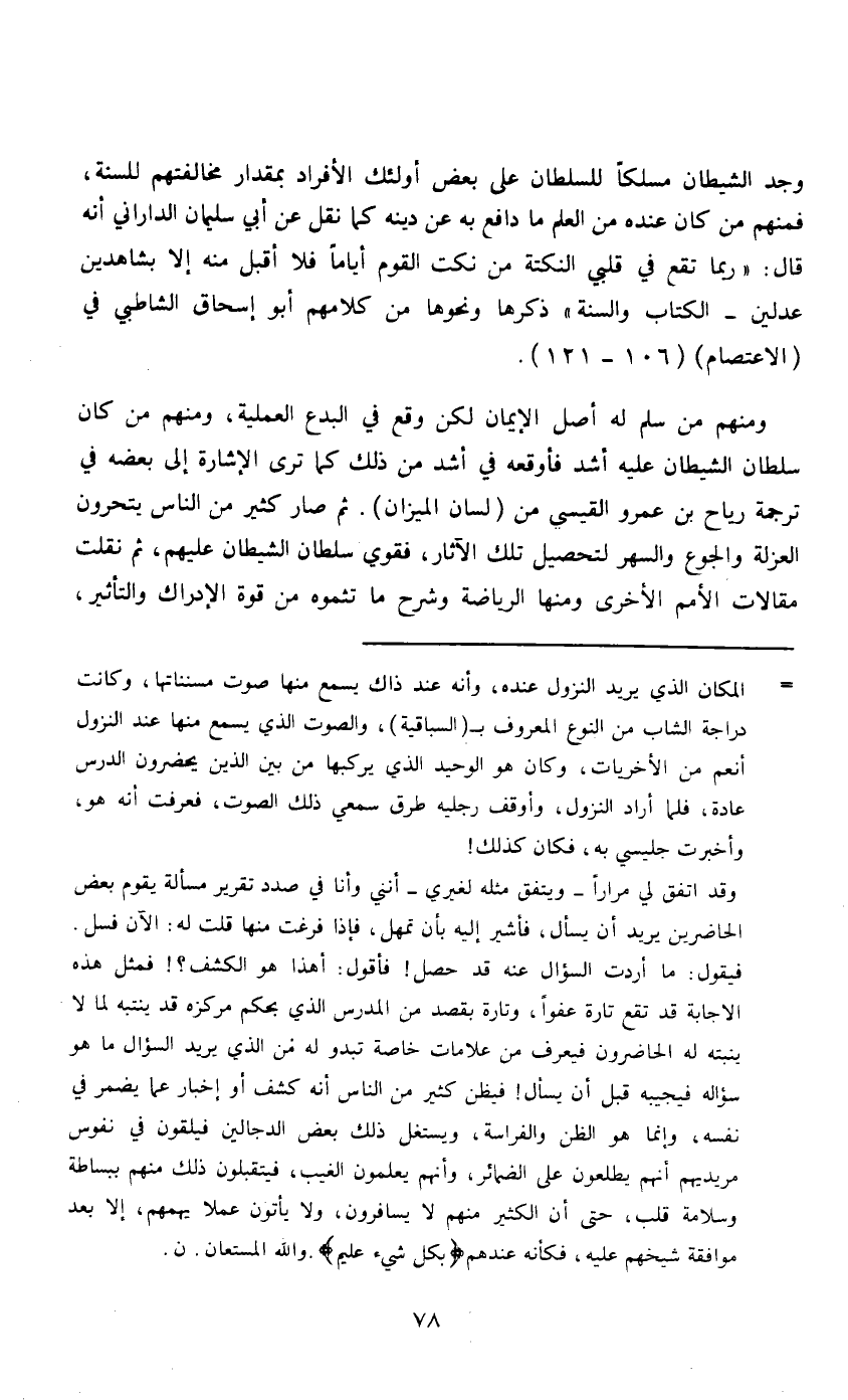 ومنهم من سلم لهم أصل الإيمان لكن وقع في البدع العملية، ومنهم من كان سلطان السلطان عليه أشد فأو قعه في أشد من ذلك كما ترى الإشارة إلى بعضه في ترجمة رياح بن عمروالقيسي من (لسان الميزان) . ثم صار كثير من الناس يتحرون العزلة والجوع والسهر لتحصيل تلك الآثار، فقوي سلطان الشيطان عليهم، ثم نقلت مقالات الأمم الأخرى ومنه الرياضة وشرح ما تثمره من قوة الإدراك والتأثير،