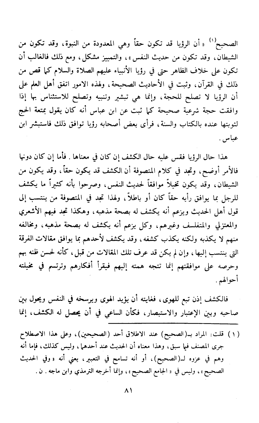 هذا حال الرؤيا فقس عليه حال الكشف إن كان في معناها. فأما إن كان دونها فالأمر أوضح، وتجد في كلام المتصوفة أن الكشف قد يكون حقاً، وقد يكون من الشيطان، وقد يكون تخيلاً موافقاً لحديث النفس، وصرحوا بأنه كثيراً ما يكشف للجل بما يوافق رأيه حقاً كان أو باطلاً، ولهذا تجد في المتصوفة من ينتسب إلى أهل الحديث ويزعم أنه يكشف له بصحة مذهبه، وهكذا تجد فيهم الأشعري والمعتزلي والمتفلسف وغيرهم، وكل يزعم أنه يكشف له بصحة مذهبه، ومخالفه منهم لا يكذبه ولكنه يكذب كشفه، وقد يكشف لأحدهم بما يوافق الفرقة التي ينتسب إليها، وإن لم يكن قد عرف تلك المقالات من قبل، كأنه لحسن ظنه بهم وحرصه على موافقتهم إنما تتجه همته إليهم فيقرأ أفكارهم وترتسم في مخيلته أحوالهم.