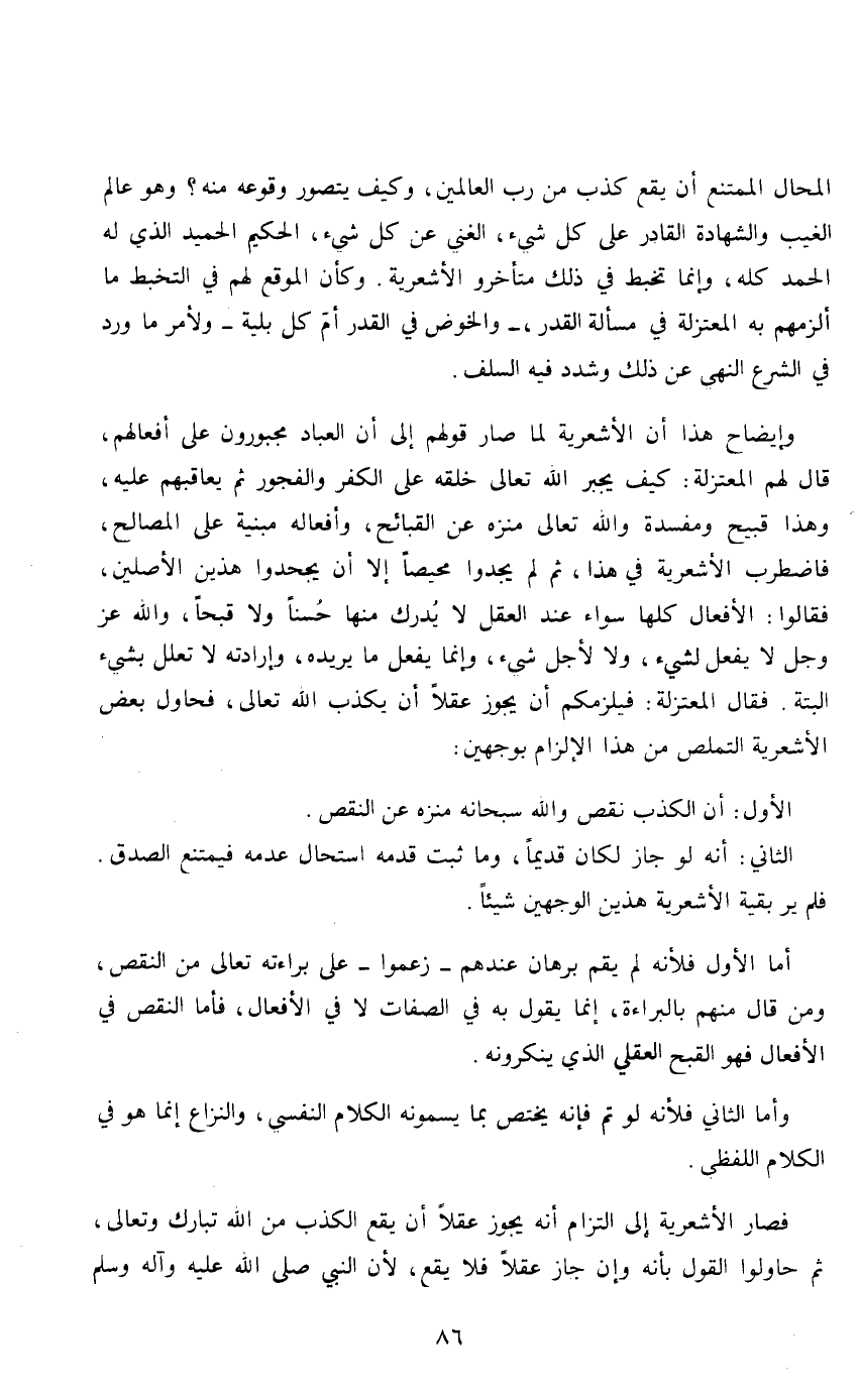 وإيضاح هذا أن الأشعرية لما صار قولهم إلى أن العباد مجبورون على أفعالهم، قال لهم المعتزلة: كيف يجبر الله تعالى خلقه على الكفر والفجور ثم يعاقبهم عليه، وهذا قبيح ومفسدة والله تعالى منزه عن القبائح، وأفعاله مبنية على المصالح، فاضطرب الأشعرية في هذا ثم لم يجدوا محيصاً إلا أن يجحدوا هذين الأصلين، فقالوا: الأفعال كلها سواء عند العقل ولا يدرك منها حسناً ولا قبحاً، والله عز وجل لا يفعل لشيء، ولا لأجل، إنما يفعل ما يريده، وإرادته لا تعلل بشيء البتة. فقال المعتزلة: فيلزمكم أن يجوز عقلاً أن يكذب الله تعالى، فحاول بعض الأشعرية التملص من هذا الإلزام بوجهين: