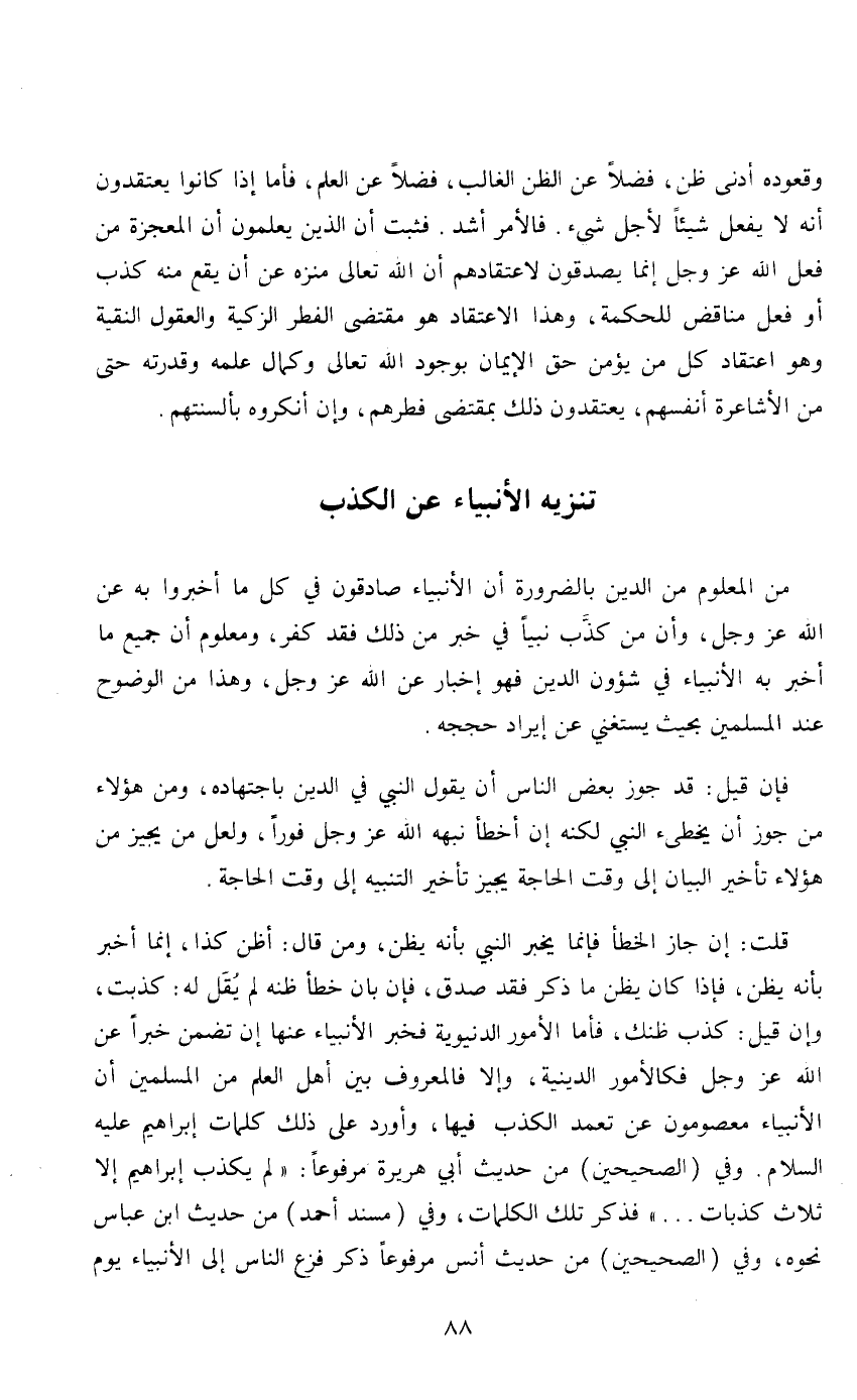 فإن قيل: قد جوز بعض الناس أن يقول النبي في الدين باجتهاده، ومن هؤلاء من جوز أن يخطئ النبي لكنه إن أخطأ نبهه الله عز وجل فوراً، ولعل من يجيز من هؤلاء تأخير البيان إلى وقت الحاجة يجيز تأخير التنبيه إلى وقت الحاجة.
