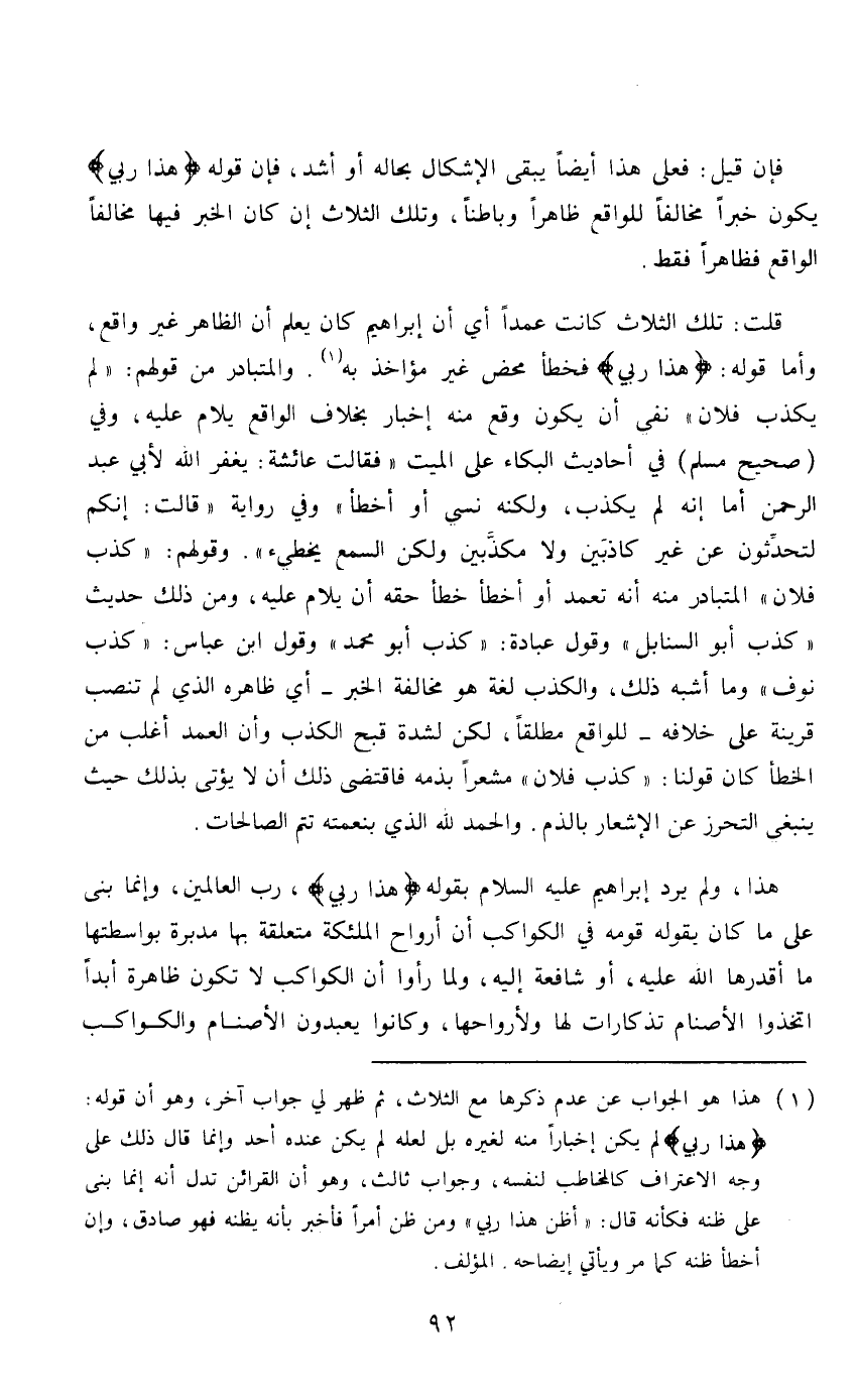قلت: تلك الثلاث كانت عمداً أي أن إبراهيم كان يعلم أن الظاهر غير واقع، وأم قوله: «هذا ربي» فخطأ محض غير مؤاخذ به (1) . والمتبادر من قولهم «لم يكذب فلان» نفي أن يكون وقع منه إخبار بخلاف الواقع يلام عليه، وفي (صحيح مسلم) في أحاديث البكاء على الميت «فقالت عائشة: يغفر الله لأبي عبد الرحمن أما إنه لم يكذب، ولكنه نسي أو أخطأ» وفي رواية «قالت: إنكم لتحدثون عن غير كاذبين ولا مكذبين ولكن السمع يخطيء» . وقولهم: «كذب فلان» المتبادر منه أنه تعمد أو أخطأ خطأ حقه أن يلام عليه، ومن ذلك حديث «كذب أبو السنابل» وقول عبادة: «كذب أبو محمد» وقول ابن عباس: «كذب نوف» وما أشبه ذلك، والكذب لغة هو مخالفة الخبر - أي ظاهره الذي لم تنصب قرينة على خلافه - للواقع مطلقاً، لكن لشدة قبح الكذب وأن العمد أغلب من الخطأ كان قولنا: «كذب فلان» مشعراً بذمه فاقتضى ذلك أن لا يؤتى بذلك حيث ينبغي التحرز عن الإشعار بالذم. والحمد لله الذي بنعمته تتم الصالحات.