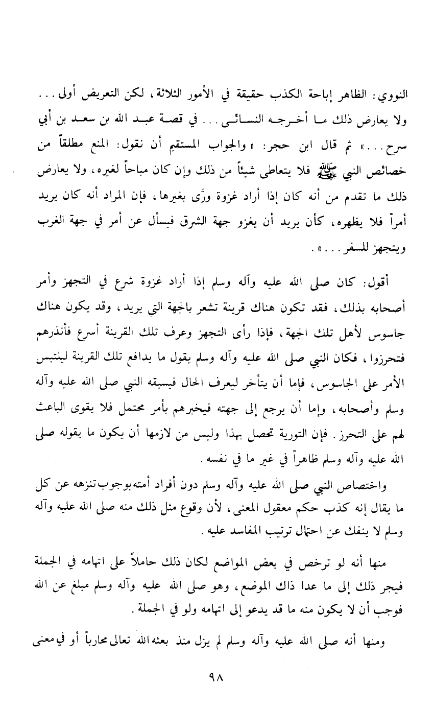 النووي: الظاهر إباحة الكذب حقيقة في الأمور الثلاثة، لكن التعريض أولى ... ولا يعارض ذلك ما أخرجه النسائي ... في قصة عبد الله بن سعيد بن أبي سرح ... » ثم قال ابن حجر: «والجواب المستقيم أن نقول: المنع مطلقاً من خصائص النبي - صلى الله عليه وسلم - فلا يتعاطى شيئاً من ذلك وإن كان إذا أراد غزوة ورى بغيرها، فإن المراد أنه كان يريد أمراً فلا يظهره، كأن يريد أن يغزووجهة الشرق فيسأل عن أمر في جهة الغرب ويتجهز للسفر ... » .