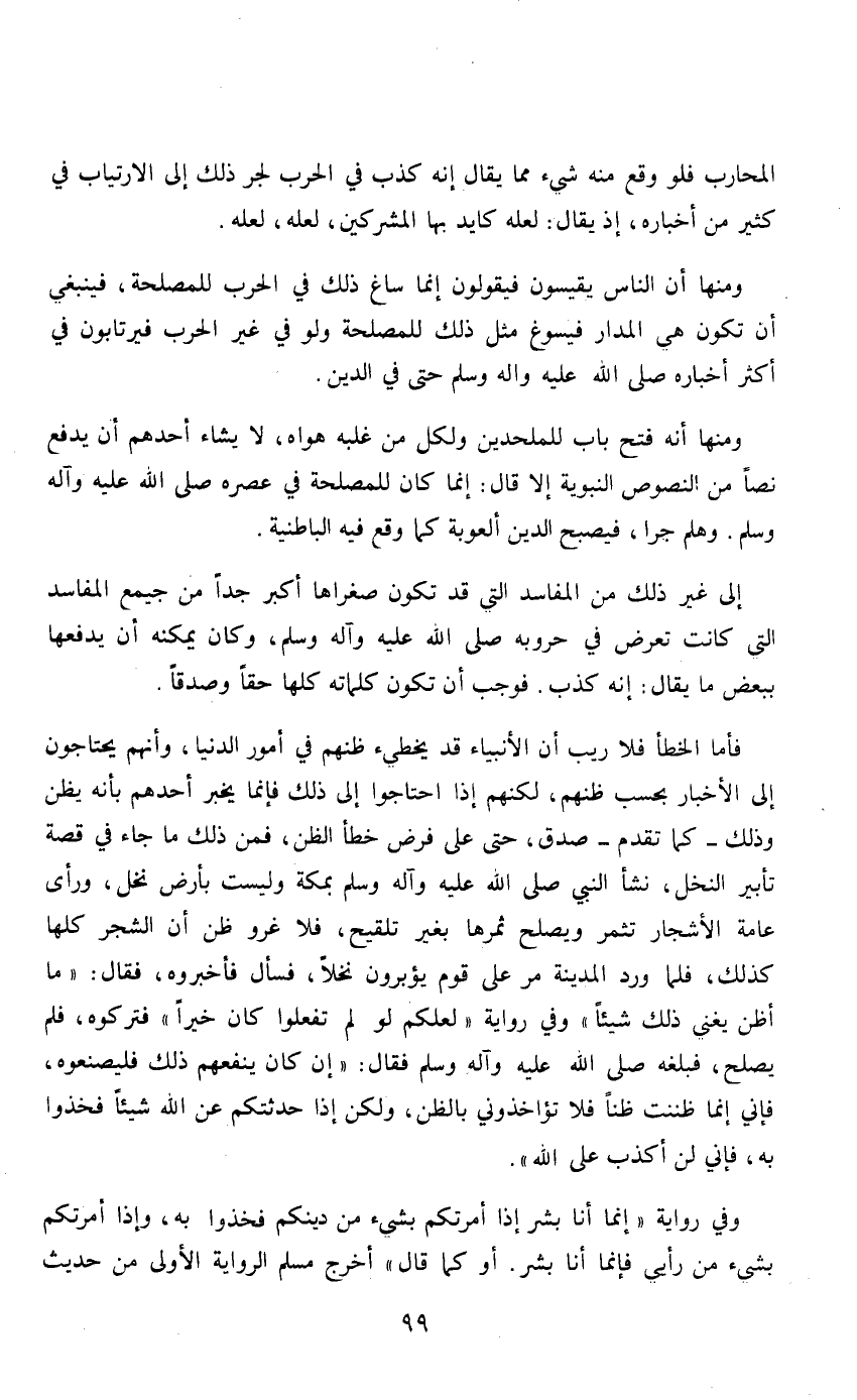 فأما الخطأ فلا ريب أن الأنبياء قد يخطئ ظنهم في أمور الدنيا، وأنهم يحتاجون إلى الأخبار بحسب ظنهم، لكنهم إذا احتاجوا إلى ذلك فإنما يخبر أحدهم بأنه يظن وذلك - كما تقدم - صدق، وحتى على فرض خطأ الظن، فمن ذلك ما جاء في قصة تأبير النخل، نشأ النبي صلى الله عليه وآله وسلم بمكة وليست بأرض نخل، ورأى عامة الأشجار تثمر ويصلح ثمرها بغير تلقيح، فلا غروظن أن الشجر كلها كذلك، فلما ورد المدينة مر على قوم يؤبرون نخلاً، فسأل فأخبروه فأخبروه، فقال: «ما أظن يغنى ذلك شيئاً» وفي رواية «لعلكم لولم تفعلوا كان خيراً» فتركوه، فلم يصلح، فبلغه صلى الله عليه وآله وسلم فقال: «إن كان ينفعهم ذلك فليصنعوه، فإني إنما ظننت ظناً فلا تؤاخذوني بالظن، ولكن إذا حدثتكم عن الله شيئاً فخذوا به، فإني لن أكذب على الله» .