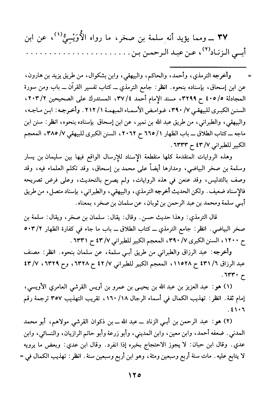 37- ومما يؤيد أنه سلمة بن صخر، هو ما رواه الأويسي، عن ابن أبي الزناد، عن عبد الرحمن بن -[126]- الحارث، عن محمد بن جعفر، عن عباد بن عبد الله بن الزبير، عن عائشة رضي الله عنها أن النبي صلى الله عليه وسلم كان في ظل فارعٍ، فجاءه رجل من بني بياضة، وذكر هذا الحديث.