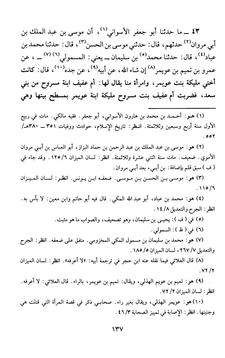 43- ما حدثنا أبو جعفر الأسواني، أن موسى بن عبد الملك بن أبي مروان حدثهم، قال: حدثني موسى بن الحسن، قال: حدثنا محمد بن عباد، قال: حدثنا محمد بن سليمان -يعني: المسمولي-، عن عمرو بن تميم بن عويمر إن شاء الله، عن أبيه، عن جده، قال: كانت أختي مليكة بنت عويمر، وامرأة منا يقال لها: أم عفيف ابنة مسروح من بني سعد، فضربت أم عفيف بنت مسروح مليكة ابنة عويمر بمسطح بيتها وهي -[138]- حامل، فقتلتها [وما في] بطنها. فقضى رسول الله صلى الله عليه وسلم فيها بالدية، وفي جنينها بغرة: عبد أو وليدة.