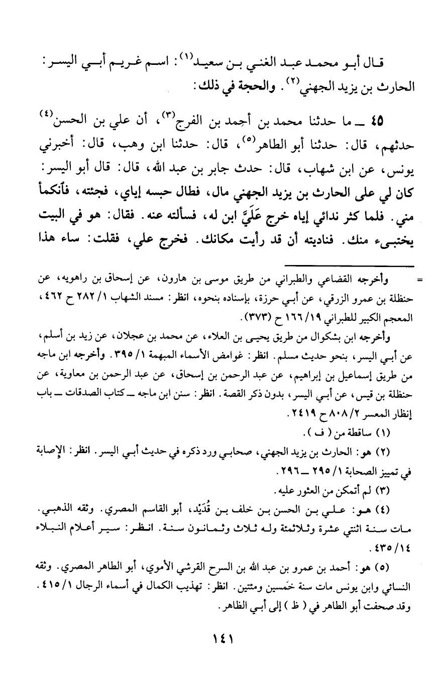 45- ما حدثنا محمد بن أحمد بن الفرج، أن علي بن الحسن حدثهم، قال: حدثنا أبو الطاهر، قال: حدثنا ابن وهب، قال: أخبرني يونس، عن ابن شهاب، قال: حدث جابر بن عبد الله، قال: قال أبو اليسر: كان لي على الحارث بن يزيد الجهني مال، فطال حبسه إياي، فجئته، فانكمأ مني. فلما كثر ندائي إياه خرج علي ابن له، فسألته عنه. فقال: هو في البيت يختبئ منك. فناديته أن قد رأيت مكانك. فخرج علي، فقلت: ساء هذا -[142]- عملاً! تمطلني وتختبئ مني؟ قال: أتاني طالب حق، وكنت معسراً، فأردت أن أتكمأ منه حتى يأتي الله بيساره.