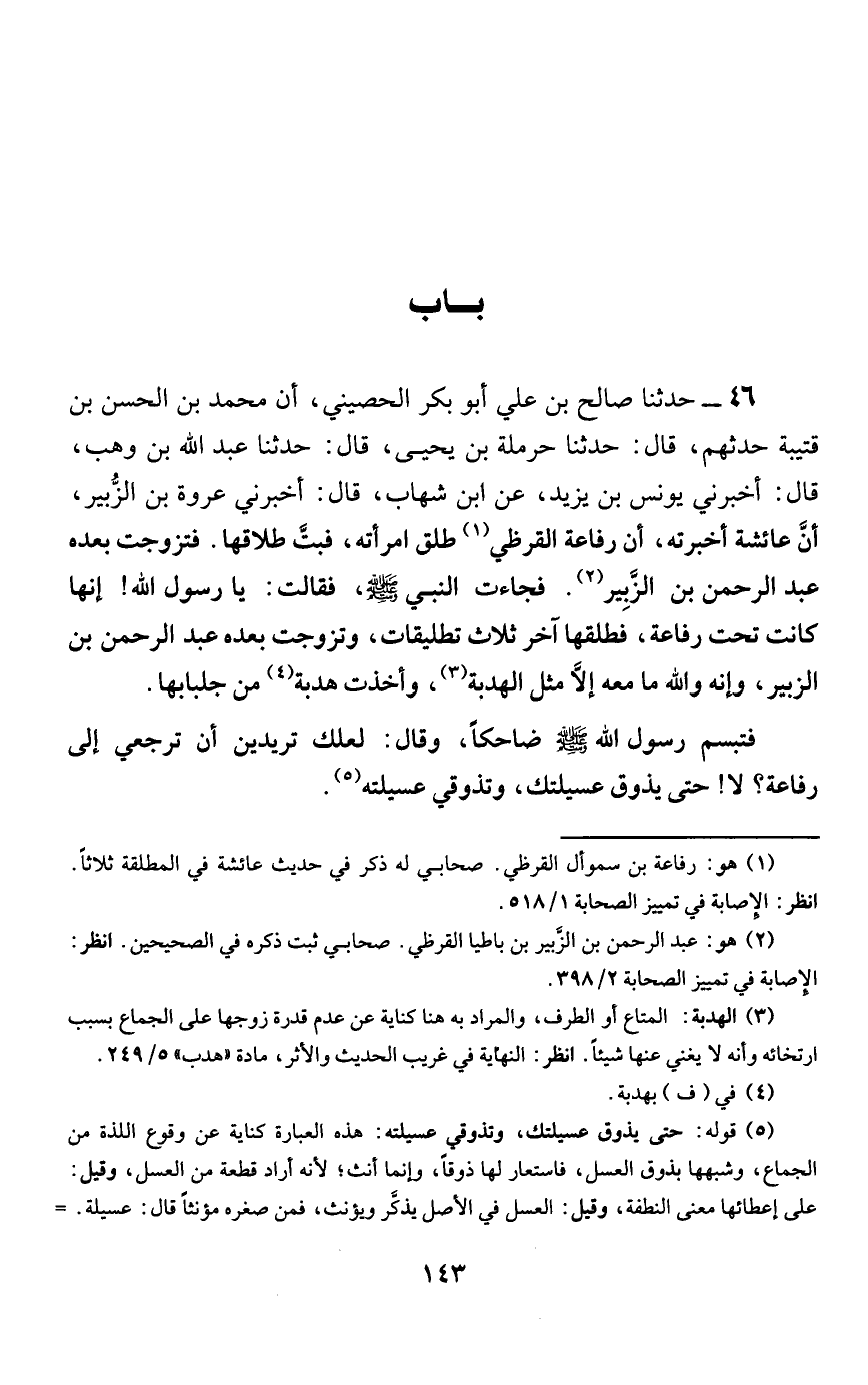 46- حدثنا صالح بن علي أبو بكر الحصيني، أن محمد بن الحسن بن قتيبة حدثهم، قال: حدثنا حرملة بن يحيى، قال: حدثنا عبد الله بن وهب، قال: أخبرني يونس بن يزيد، عن ابن شهاب، قال: أخبرني عروة بن الزبير، أن عائشة أخبرته، أن رفاعة القرظي طلق امرأته، فبت طلاقها. فتزوجت بعده عبد الرحمن بن الزبير. فجاءت النبي صلى الله عليه وسلم، فقالت: يا رسول الله! إنها كانت تحت رفاعة، فطلقها آخر ثلاث تطليقات، وتزوجت بعده عبد الرحمن بن الزبير، وإنه والله ما معه إلا مثل الهدبة، وأخذت هدبة من جلبابها.