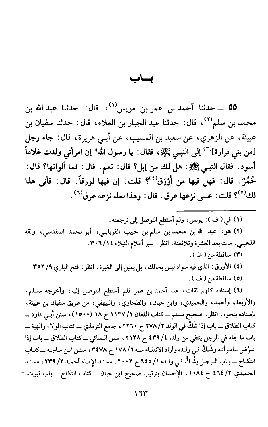 55- حدثنا أحمد بن عمر بن مويس، قال: حدثنا عبد الله بن محمد بن سلم، قال: حدثنا عبد الجبار بن العلاء، قال: حدثنا سفيان بن عيينة، عن الزهري، عن سعيد بن المسيب، عن أبي هريرة، قال: جاء رجل [من بني فزارة] إلى النبي صلى الله عليه وسلم، فقال: يا رسول الله! إن امرأتي ولدت غلاماً أسود. فقال النبي صلى الله عليه وسلم: هل لك من إبل؟ قال: نعم. قال: فما ألوانها؟ قال: حمرٌ. قال: فهل فيها من أورق؟ قلت: إن فيها لورقاً. قال: فأنى هذا لك؟ قلت: عسى نزعها عرق. قال: وهذا لعله نزعه عرق.
