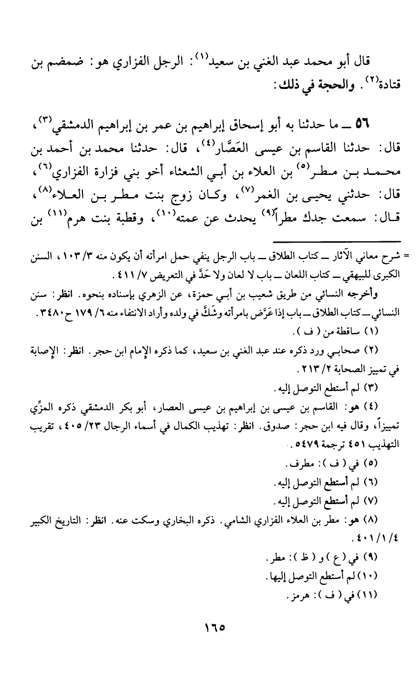 56- ما حدثنا به أبو إسحاق إبراهيم بن عمر بن إبراهيم الدمشقي، قال: حدثنا القاسم بن عيسى العصار، قال: حدثنا محمد بن أحمد بن محمد بن مطر بن العلاء بن أبي الشعثاء أخو بني فزراة الفزاري، قال: حدثني يحيى بن الغمر، وكان زوج بنت مطر بن العلاء، قال: سمعت جدك مطراً يحدث عن عمته، وقطبة بنت هرم بن -[166]- قطبة، أن مدلوكاً حدثهم، أن ضمضم بن قتادة ولد له مولود أسود، من امرأة له من بني عجل، فأوحش لذلك، فشكا إلى النبي صلى الله عليه وسلم. فقال: هل لك من إبل؟ قال: نعم. قال: فما ألوانها؟ قال: فيها الأحمر والأسود وغير ذلك، قال: فأنى ذلك؟ قال: عرق نزع. قال: وهذا عرق نزع.