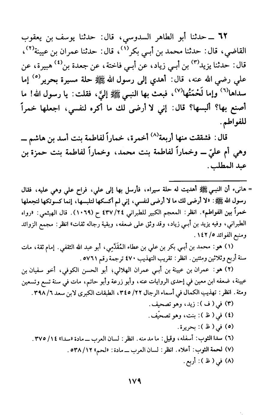 62- حدثنا أبو الطاهر السدوسي، قال: حدثنا يوسف بن يعقوب القاضي، قال: حدثنا محمد بن أبي بكر، قال: حدثنا عمران بن عيينة، قال: حدثنا يزيد بن أبي زياد، عن أبي فاختة، عن جعدة بن هبيرة، عن علي رضي الله عنه، قال: أهدي إلى رسول الله صلى الله عليه وسلم حلة مسيرة بحرير إما سداها وإما لحمتها، فبعث بها النبي صلى الله عليه وسلم إلي، فقلت: يا رسول الله! ما أصنع بها؟ ألبسها؟ قال: إني لا أرضى لك ما أكره لنفسي، اجعلها خمراً للفواطم.