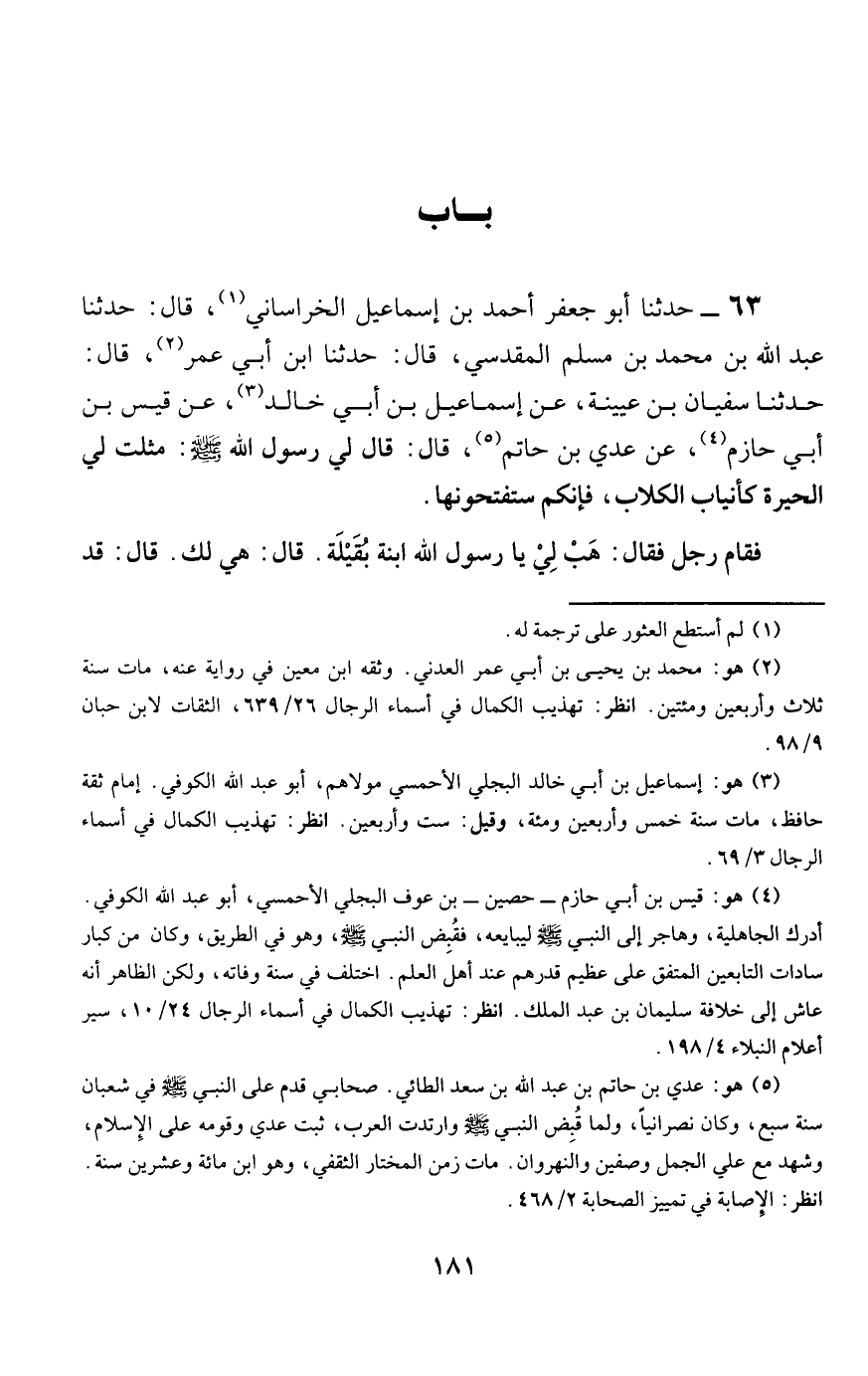 63- حدثنا أبو جعفر أحمد بن إسماعيل الخراساني، قال: حدثنا عبد الله بن محمد بن مسلم المقدسي، قال: حدثنا ابن أبي عمر، قال: حدثنا سفيان بن عيينة، عن إسماعيل بن أبي خالد، عن قيس بن أبي حازم، عن عدي بن حاتم، قال: قال لي رسول الله صلى الله عليه وسلم: مثلت لي الحيرة كأنياب الكلاب، فإنكم ستفتحونها.