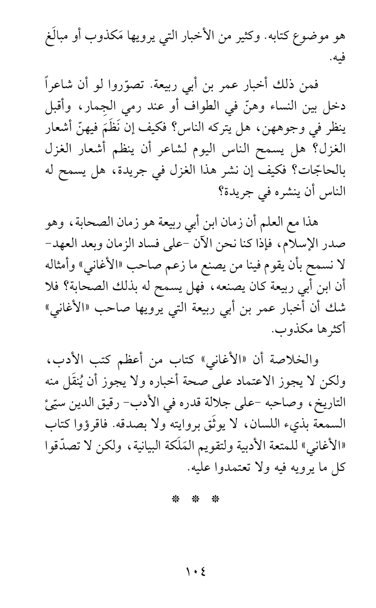 هذا مع العلم أن زمان ابن أبي ربيعة هو زمان الصحابة، وهو صدر الإسلام، فإذا كنا نحن الآن -على فساد الزمان وبعد العهد- لا نسمح بأن يقوم فينا من يصنع ما زعم صاحب «الأغاني» وأمثاله أن ابن أبي ربيعة كان يصنعه، فهل يسمح له بذلك الصحابة؟ فلا شك أن أخبار عمر بن أبي ربيعة التي يرويها صاحب «الأغاني» أكثرها مكذوب.