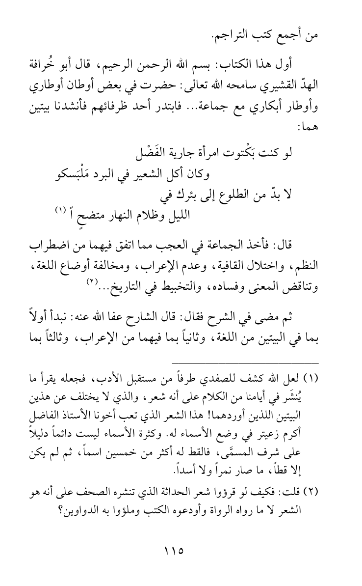 (¬1) لعل الله كشف للصفدي طرفاً من مستقبل الأدب، فجعله يقرأ ما يُنشَر في أيامنا من الكلام على أنه شعر، والذي لا يختلف عن هذين البيتين اللذين أوردهما! هذا الشعر الذي تعب أخونا الأستاذ الفاضل أكرم زعيتر في وضع الأسماء له. وكثرة الأسماء ليست دائماً دليلاً على شرف المسمَّى، فالقط له أكثر من خمسين اسماً، ثم لم يكن إلا قطاً، ما صار نمراً ولا أسداً.