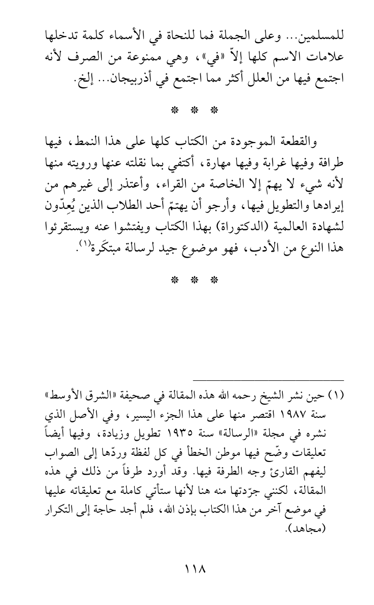 (¬1) حين نشر الشيخ رحمه الله هذه المقالة في صحيفة «الشرق الأوسط» سنة 1987 اقتصر منها على هذا الجزء اليسير، وفي الأصل الذي نشره في مجلة «الرسالة» سنة 1935 تطويل وزيادة، وفيها أيضاً تعليقات وضّح فيها موطن الخطأ في كل لفظة وردّها إلى الصواب ليفهم القارئ وجه الطرفة فيها. وقد أورد طرفاً من ذلك في هذه المقالة، لكنني جرّدتها منه هنا لأنها ستأتي كاملة مع تعليقاته عليها في موضع آخر من هذا الكتاب بإذن الله، فلم أجد حاجة إلى التكرار (مجاهد).