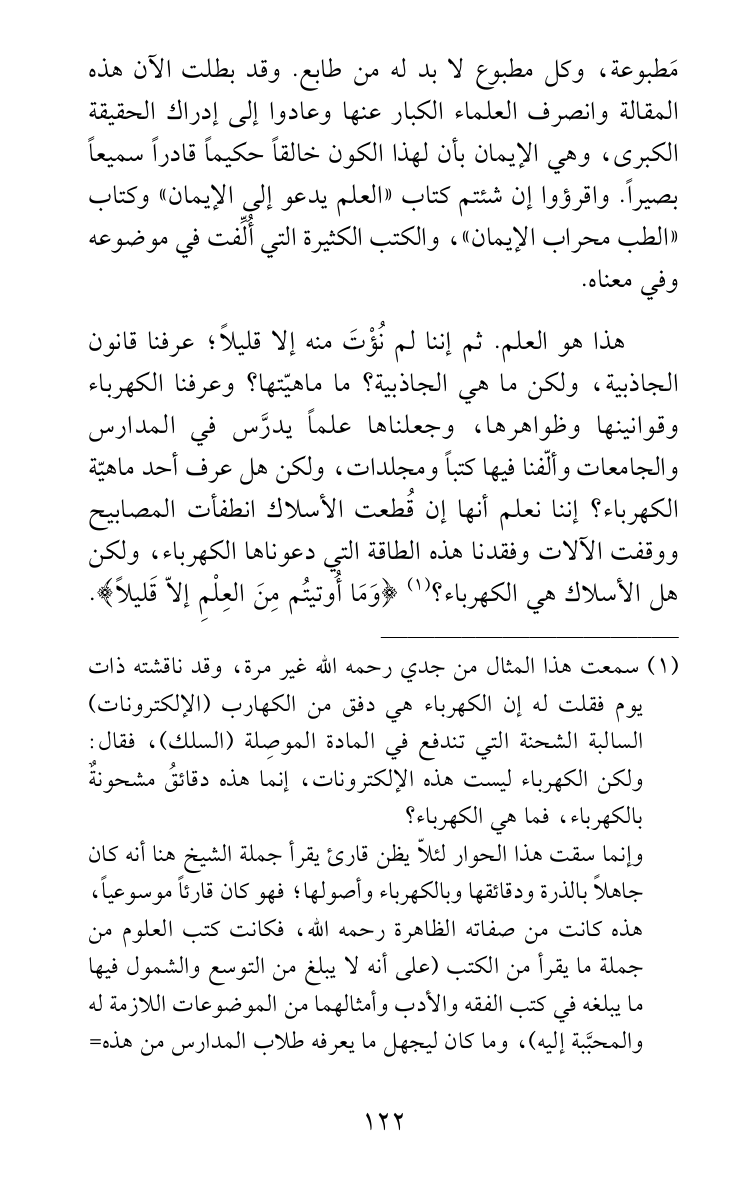 وإنما سقت هذا الحوار لئلاّ يظن قارئ يقرأ جملة الشيخ هنا أنه كان جاهلاً بالذرة ودقائقها وبالكهرباء وأصولها؛ فهو كان قارئاً موسوعياً، هذه كانت من صفاته الظاهرة رحمه الله، فكانت كتب العلوم من جملة ما يقرأ من الكتب (على أنه لا يبلغ من التوسع والشمول فيها ما يبلغه في كتب الفقه والأدب وأمثالهما من الموضوعات اللازمة له والمحبَّبة إليه)، وما كان ليجهل ما يعرفه طلاب المدارس من هذه=