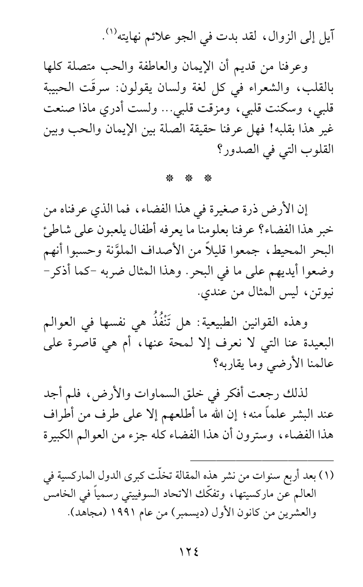 (¬1) بعد أربع سنوات من نشر هذه المقالة تخلّت كبرى الدول الماركسية في العالم عن ماركسيتها، وتفكّك الاتحاد السوفييتي رسمياً في الخامس والعشرين من كانون الأول (ديسمبر) من عام 1991 (مجاهد).