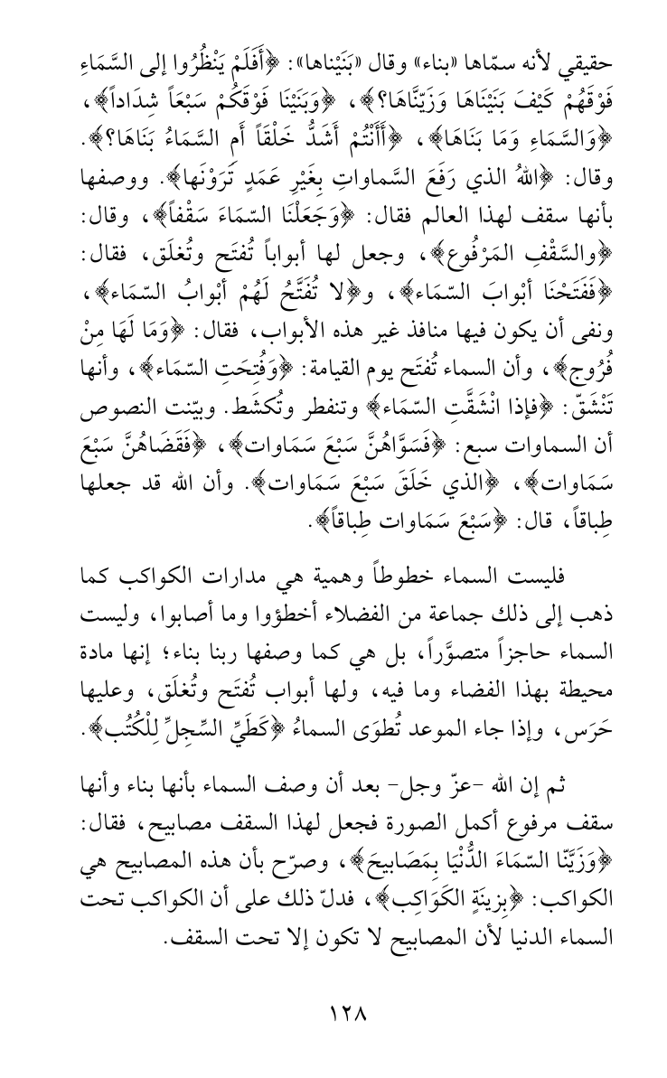 حقيقي لأنه سمّاها «بناء» وقال «بَنَيْناها»: {أَفَلَمْ يَنْظُرُوا إلى السَّمَاءِ فَوْقَهُمْ كَيْفَ بَنَيْنَاهَا وَزَيّنَّاهَا؟}، {وَبَنَيْنَا فَوْقَكُمْ سَبْعَاً شِدَاداً}، {وَالسَّمَاءِ وَمَا بَنَاهَا}، {أَأَنْتُمْ أَشَدُّ خَلْقَاً أَمِ السَّمَاءُ بَنَاهَا؟}. وقال: {اللهُ الذي رَفَعَ السَّماواتِ بِغَيْرِ عَمَدٍ تَرَوْنَها}. ووصفها بأنها سقف لهذا العالم فقال: {وَجَعَلْنَا السّمَاءَ سَقْفاً}، وقال: {والسَّقْفِ المَرْفُوع}، وجعل لها أبواباً تُفتَح وتُغلَق، فقال: {فَفَتَحْنَا أبْوابَ السّمَاء}، و {لا تُفَتَّحُ لَهُمْ أبْوابُ السّمَاء}، ونفى أن يكون فيها منافذ غير هذه الأبواب، فقال: {وَمَا لَهَا مِنْ فُرُوج}، وأن السماء تُفتَح يوم القيامة: {وَفُتِحَتِ السّمَاء}، وأنها تَنْشَقّ: {فإذا انْشَقَّتِ السّمَاء} وتنفطر وتُكشَط. وبيّنت النصوص أن السماوات سبع: {فَسَوَّاهُنَّ سَبْعَ سَمَاوات}، {فَقَضَاهُنَّ سَبْعَ سَمَاوات}، {الذي خَلَقَ سَبْعَ سَمَاوات}. وأن الله قد جعلها طِباقاً، قال: {سَبْعَ سَمَاوات طِباقاً}.