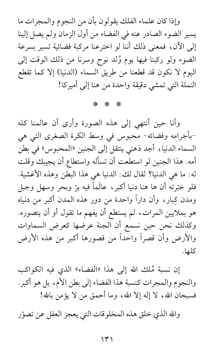 وإذا كان علماء الفلك يقولون بأن من النجوم والمجرات ما يسير الضوء الصادر عنه في الفضاء من أول الزمان ولم يصل إلينا إلى الآن، فمعنى ذلك أننا لو اخترعنا مركبة فضائية تسير بسرعة الضوء ولو ركبنا فيها يوم وُلد نوح وسرنا من ذلك الوقت إلى اليوم لا نكون قد قطعنا من طريق السماء (الدنيا) إلا كما تقطع النملة التي تمشي دقيقة واحدة من هنا إلى أميركا!