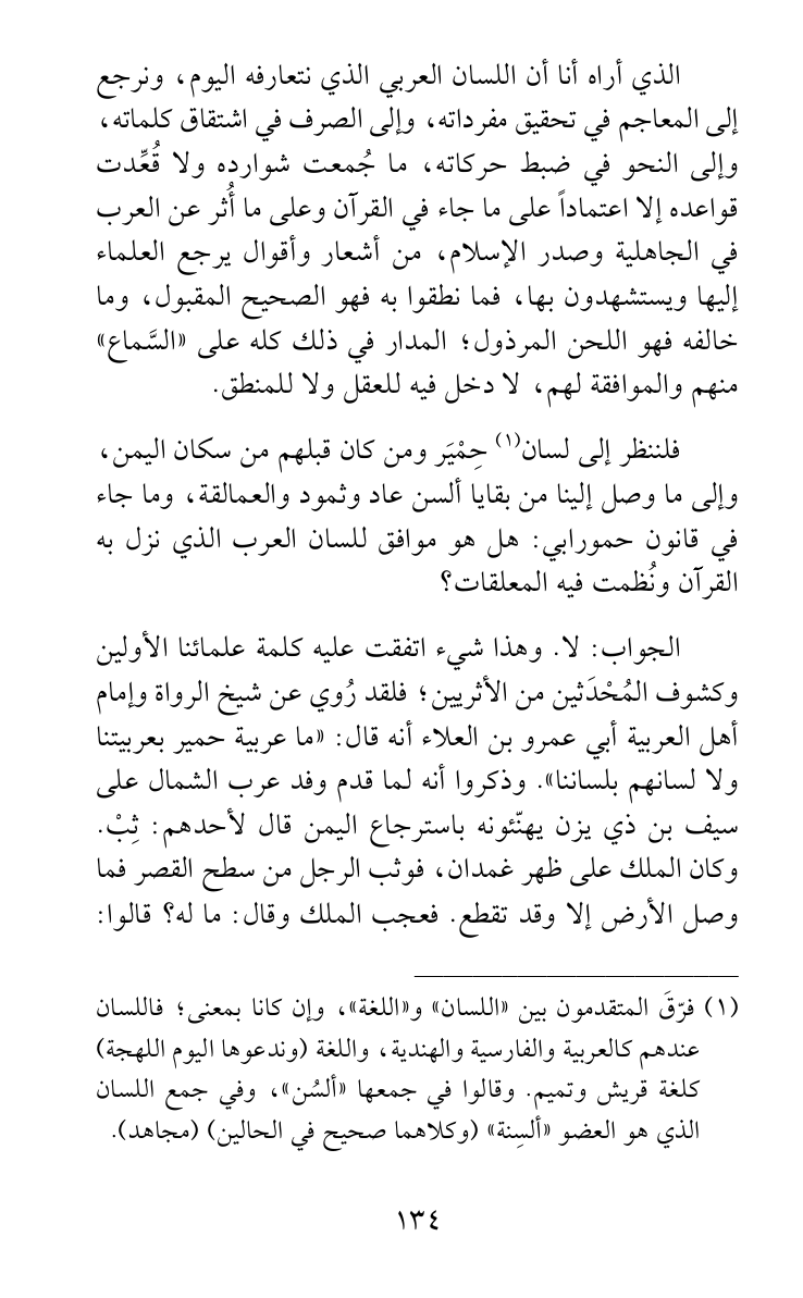 فلننظر إلى لسان (¬1) حِمْيَر ومن كان قبلهم من سكان اليمن، وإلى ما وصل إلينا من بقايا ألسن عاد وثمود والعمالقة، وما جاء في قانون حمورابي: هل هو موافق للسان العرب الذي نزل به القرآن ونُظمت فيه المعلقات؟