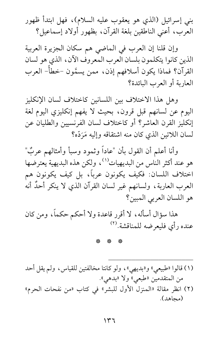 وإن قلنا إن العرب في الماضي هم سكان الجزيرة العربية الذين كانوا يتكلمون بلسان العرب المعروف الآن، الذي هو لسان القرآن؟ فماذا يكون أسلافهم إذن، ممن يسمَّون -خطأً- العرب العاربة أو العرب البائدة؟