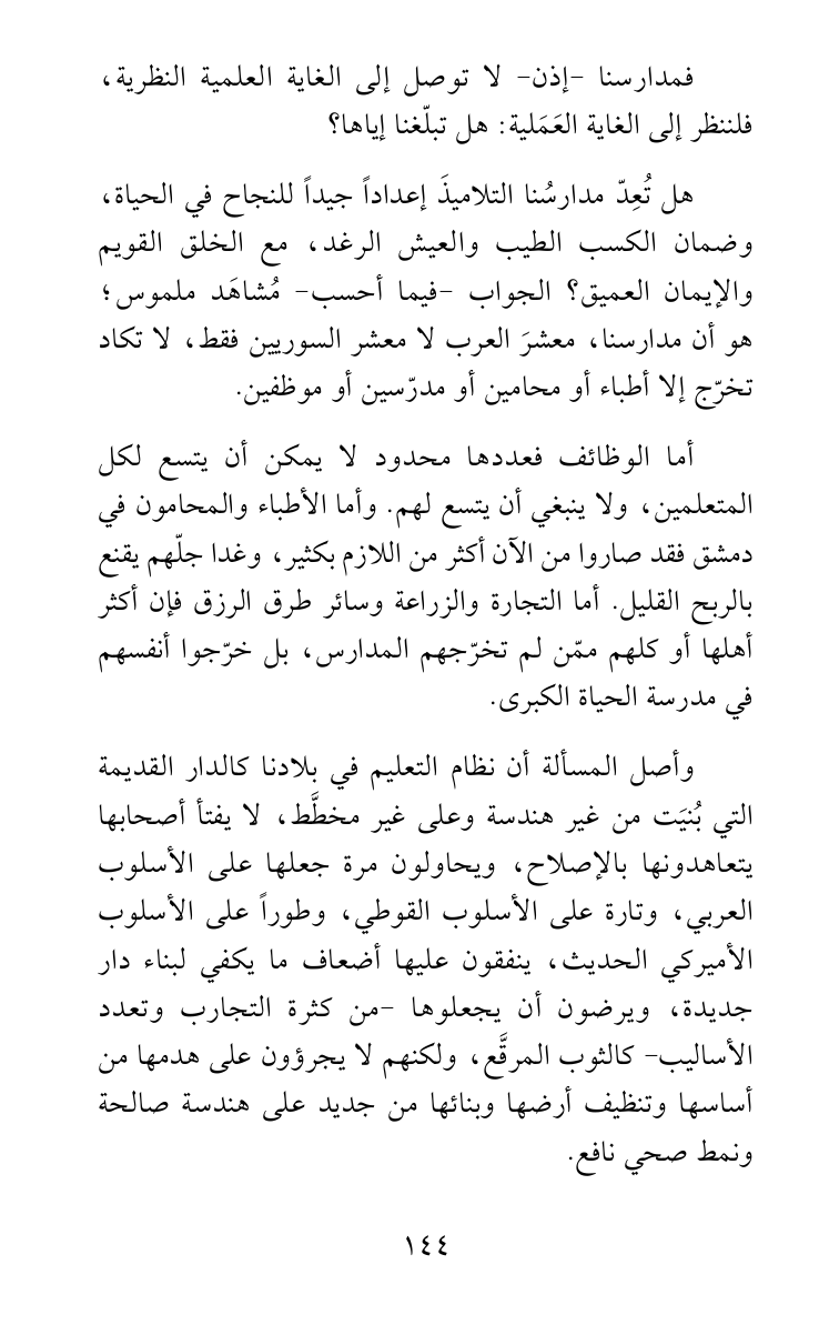 هل تُعِدّ مدارسُنا التلاميذَ إعداداً جيداً للنجاح في الحياة، وضمان الكسب الطيب والعيش الرغد، مع الخلق القويم والإيمان العميق؟ الجواب -فيما أحسب- مُشاهَد ملموس؛ هو أن مدارسنا، معشرَ العرب لا معشر السوريين فقط، لا تكاد تخرّج إلا أطباء أو محامين أو مدرّسين أو موظفين.