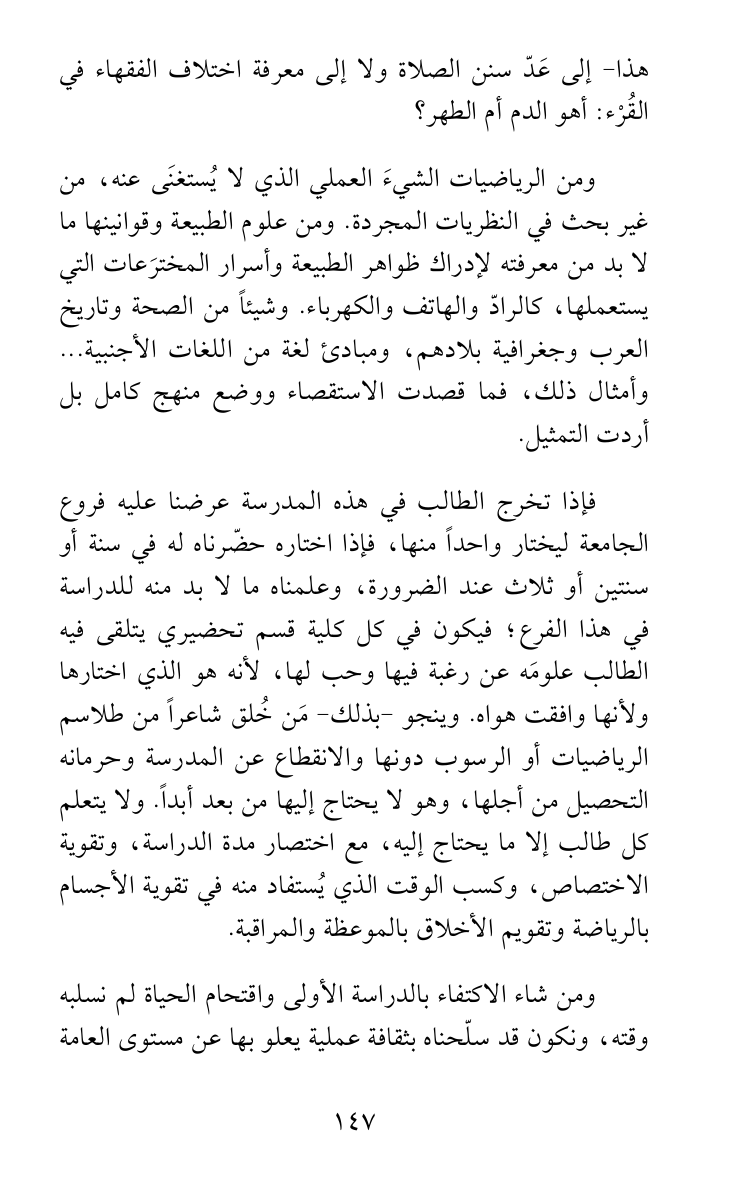 ومن الرياضيات الشيءَ العملي الذي لا يُستغنَى عنه، من غير بحث في النظريات المجردة. ومن علوم الطبيعة وقوانينها ما لا بد من معرفته لإدراك ظواهر الطبيعة وأسرار المخترَعات التي يستعملها، كالرادّ والهاتف والكهرباء. وشيئاً من الصحة وتاريخ العرب وجغرافية بلادهم، ومبادئ لغة من اللغات الأجنبية ... وأمثال ذلك، فما قصدت الاستقصاء ووضع منهج كامل بل أردت التمثيل.