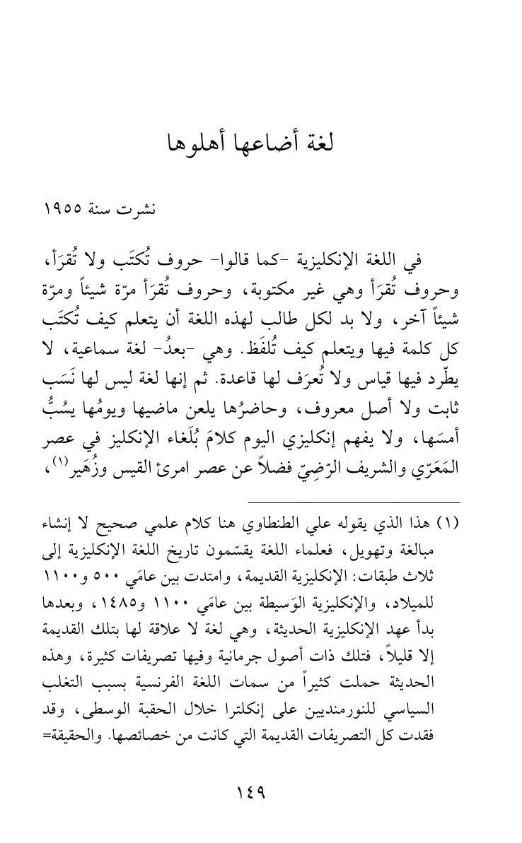 (¬1) هذا الذي يقوله علي الطنطاوي هنا كلام علمي صحيح لا إنشاء مبالغة وتهويل، فعلماء اللغة يقسّمون تاريخ اللغة الإنكليزية إلى ثلاث طبقات: الإنكليزية القديمة، وامتدت بين عامَي 500 و1100 للميلاد، والإنكليزية الوَسيطة بين عامَي 1100 و1485، وبعدها بدأ عهد الإنكليزية الحديثة، وهي لغة لا علاقة لها بتلك القديمة إلا قليلاً، فتلك ذات أصول جرمانية وفيها تصريفات كثيرة، وهذه الحديثة حملت كثيراً من سمات اللغة الفرنسية بسبب التغلب السياسي للنورمنديين على إنكلترا خلال الحقبة الوسطى، وقد فقدت كل التصريفات القديمة التي كانت من خصائصها. والحقيقة=