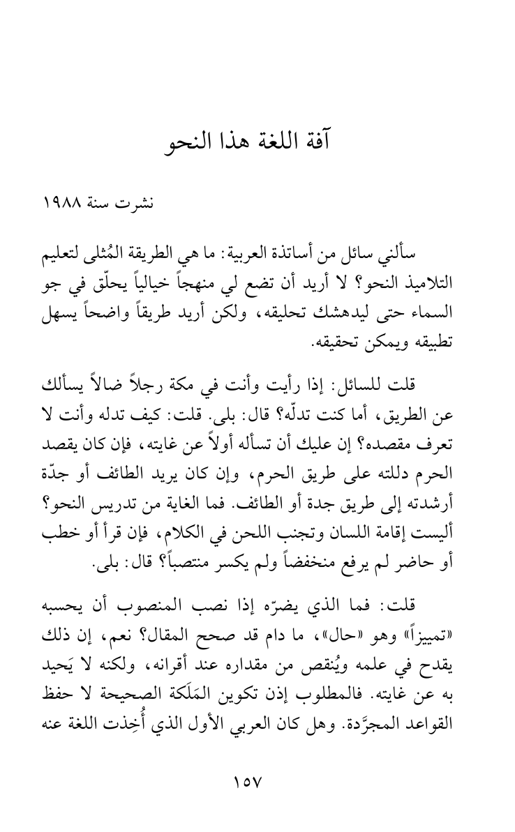 قلت للسائل: إذا رأيت وأنت في مكة رجلاً ضالاً يسألك عن الطريق، أما كنت تدلّه؟ قال: بلى. قلت: كيف تدله وأنت لا تعرف مقصده؟ إن عليك أن تسأله أولاً عن غايته، فإن كان يقصد الحرم دللته على طريق الحرم، وإن كان يريد الطائف أو جدّة أرشدته إلى طريق جدة أو الطائف. فما الغاية من تدريس النحو؟ أليست إقامة اللسان وتجنب اللحن في الكلام، فإن قرأ أو خطب أو حاضر لم يرفع منخفضاً ولم يكسر منتصباً؟ قال: بلى.