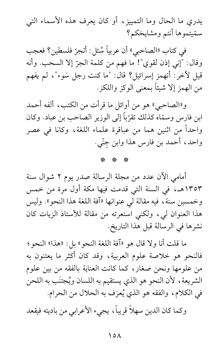 ما قلت أنا ولا قال هو «آفة اللغة النحو» بل: «هذا» النحو؛ فالنحو هو خلاصة علوم العربية، وقد كان أكثر ما يعتنون به من علومها ونحن صغار، كما كانت العناية بالفقه من بين علوم الشريعة، لأن النحو هو الذي يستقيم به اللسان ويُجتنَب به اللحن في الكلام، والفقه هو الذي يُعرَف به الحلال من الحرام.