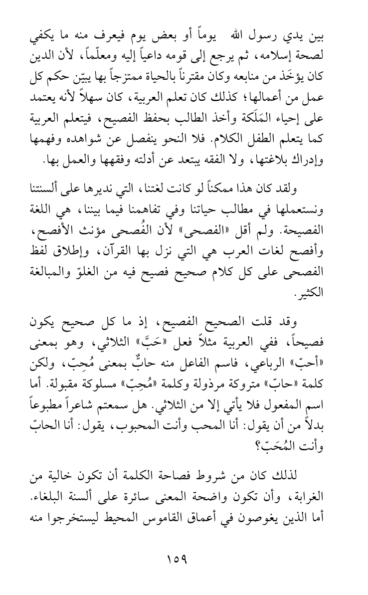 ولقد كان هذا ممكناً لو كانت لغتنا، التي نديرها على ألسنتنا ونستعملها في مطالب حياتنا وفي تفاهمنا فيما بيننا، هي اللغة الفصيحة. ولم أقل «الفصحى» لأن الفُصحى مؤنث الأفصح، وأفصح لغات العرب هي التي نزل بها القرآن، وإطلاق لفظ الفصحى على كل كلام صحيح فصيح فيه من الغلوّ والمبالغة الكثير.