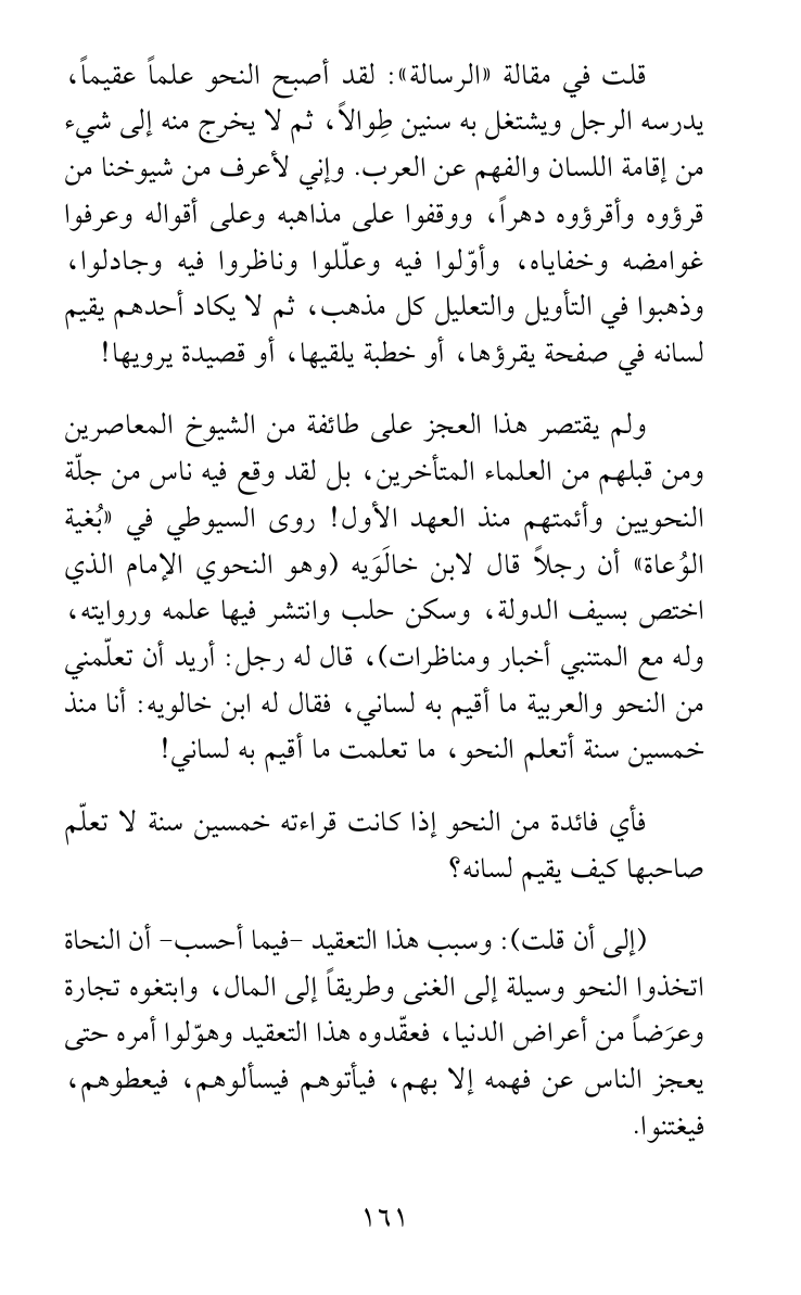 فأي فائدة من النحو إذا كانت قراءته خمسين سنة لا تعلّم صاحبها كيف يقيم لسانه؟