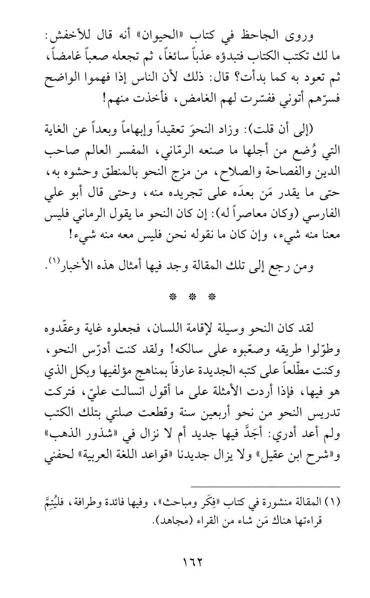 لقد كان النحو وسيلة لإقامة اللسان، فجعلوه غاية وعقّدوه وطوّلوا طريقه وصعّبوه على سالكه! ولقد كنت أدرّس النحو، وكنت مطّلعاً على كتبه الجديدة عارفاً بمناهج مؤلفيها وبكل الذي هو فيها، فإذا أردت الأمثلة على ما أقول انسالت عليّ، فتركت تدريس النحو من نحو أربعين سنة وقطعت صلتي بتلك الكتب ولم أعد أدري: أجَدَّ فيها جديد أم لا نزال في «شذور الذهب» و «شرح ابن عقيل» ولا يزال جديدنا «قواعد اللغة العربية» لحفني