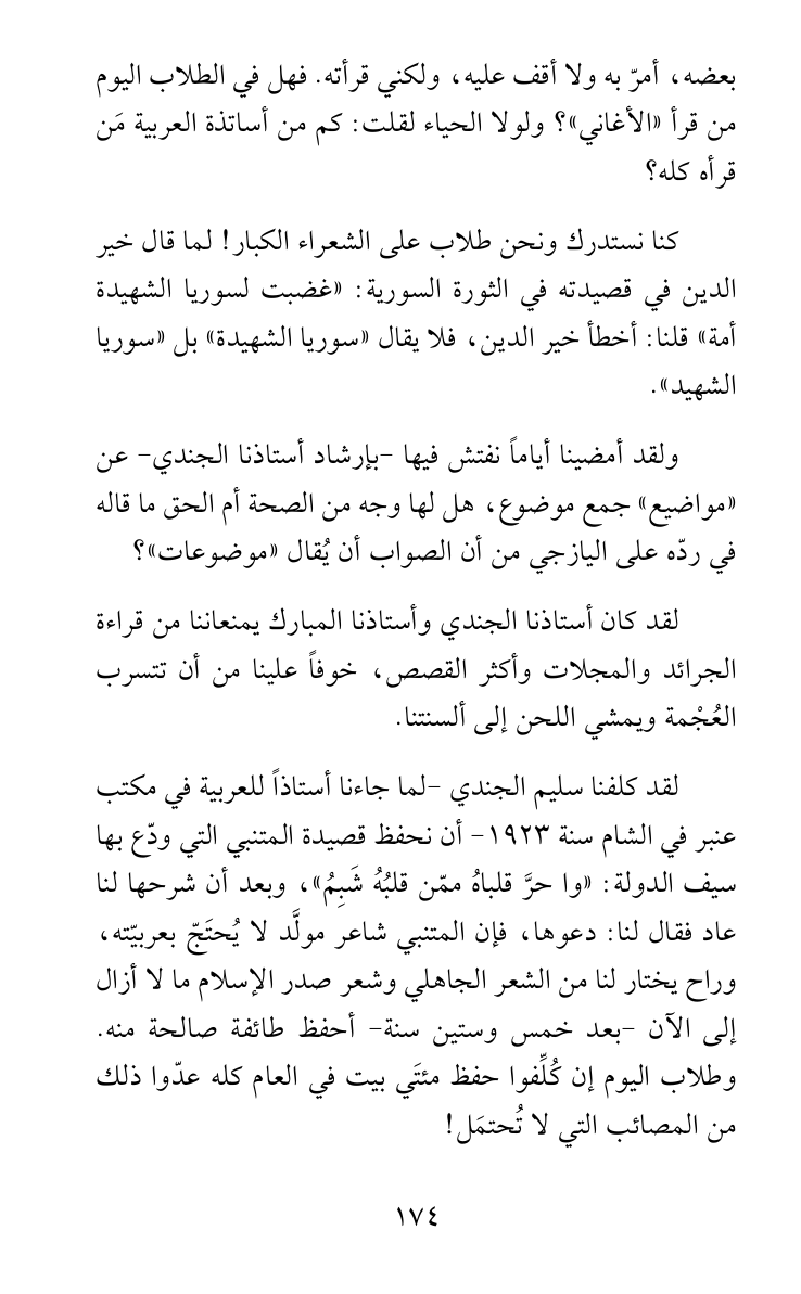 لقد كلفنا سليم الجندي -لما جاءنا أستاذاً للعربية في مكتب عنبر في الشام سنة 1923 - أن نحفظ قصيدة المتنبي التي ودّع بها سيف الدولة: «وا حرَّ قلباهُ ممّن قلبُهُ شَبِمُ»، وبعد أن شرحها لنا عاد فقال لنا: دعوها، فإن المتنبي شاعر مولَّد لا يُحتَجّ بعربيّته، وراح يختار لنا من الشعر الجاهلي وشعر صدر الإسلام ما لا أزال إلى الآن -بعد خمس وستين سنة- أحفظ طائفة صالحة منه. وطلاب اليوم إن كُلِّفوا حفظ مئتَي بيت في العام كله عدّوا ذلك من المصائب التي لا تُحتمَل!