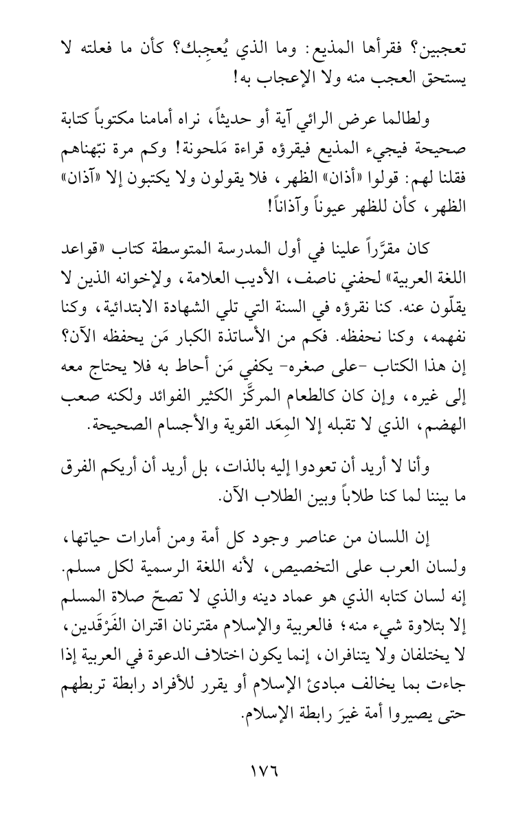 كان مقرَّراً علينا في أول المدرسة المتوسطة كتاب «قواعد اللغة العربية» لحفني ناصف، الأديب العلامة، ولإخوانه الذين لا يقلّون عنه. كنا نقرؤه في السنة التي تلي الشهادة الابتدائية، وكنا نفهمه، وكنا نحفظه. فكم من الأساتذة الكبار مَن يحفظه الآن؟ إن هذا الكتاب -على صغره- يكفي مَن أحاط به فلا يحتاج معه إلى غيره، وإن كان كالطعام المركَّز الكثير الفوائد ولكنه صعب الهضم، الذي لا تقبله إلا المِعَد القوية والأجسام الصحيحة.