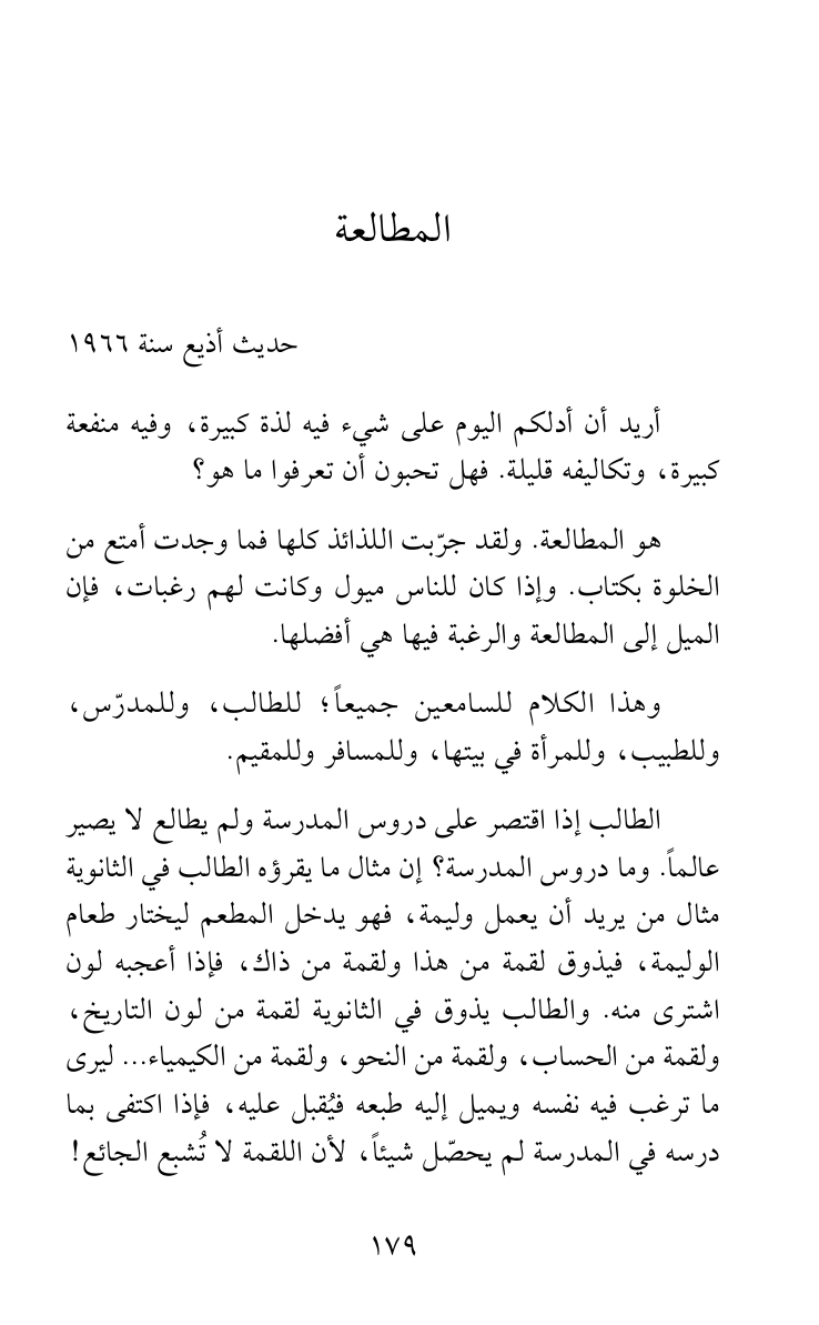 الطالب إذا اقتصر على دروس المدرسة ولم يطالع لا يصير عالماً. وما دروس المدرسة؟ إن مثال ما يقرؤه الطالب في الثانوية مثال من يريد أن يعمل وليمة، فهو يدخل المطعم ليختار طعام الوليمة، فيذوق لقمة من هذا ولقمة من ذاك، فإذا أعجبه لون اشترى منه. والطالب يذوق في الثانوية لقمة من لون التاريخ، ولقمة من الحساب، ولقمة من النحو، ولقمة من الكيمياء ... ليرى ما ترغب فيه نفسه ويميل إليه طبعه فيُقبل عليه، فإذا اكتفى بما درسه في المدرسة لم يحصّل شيئاً، لأن اللقمة لا تُشبع الجائع!