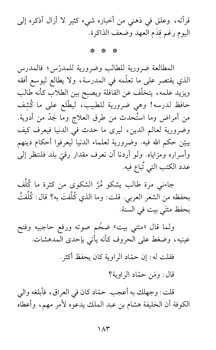 جاءني مرة طالب يشكو مُرَّ الشكوى من كثرة ما كُلِّف بحفظه من الشعر العربي. قلت: وما الذي كُلِّفتَ به؟ قال: كُلِّفتُ بحفظ مئتَي بيت في السنة.